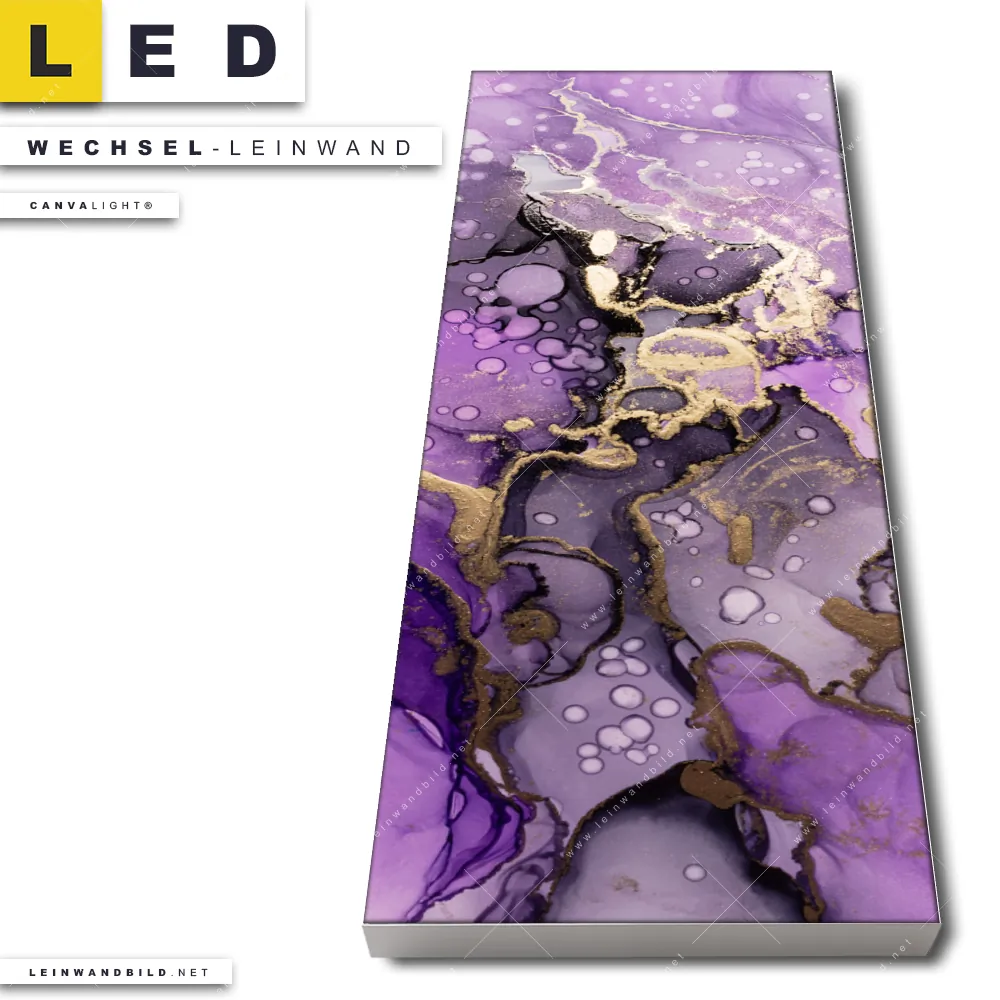 Du konfigurierst Deine individuelle LED Wechsel-Leinwand Canvalight® TEX | Fluid Art Violett | Schmal und wir produzieren sie NEU für Dich. Unsere Muster - Texturen Austausch-Fotoleinwände für Canvalight® LED Bilder sind KEINE Lagerware. Du bist Dir unsicher, welches Motiv oder Format das richtige für dein individuelles LED Wechselmotiv auf Leinwand ist, dann helfen wir dir gerne weiter und beraten dich!