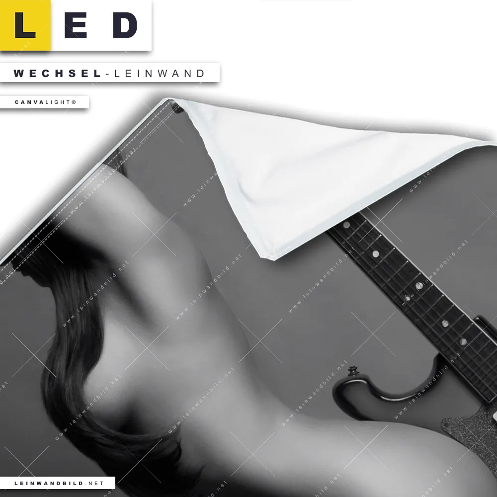Bitte beachte, dass die Farben, der auf dem Monitor abgebildeten erotische Pose einer Frau mit Gitarre Darstellung, möglicherweise von den Originalfarben deiner Canvalight® TEX Wechsel-Leinwand abweichen können.