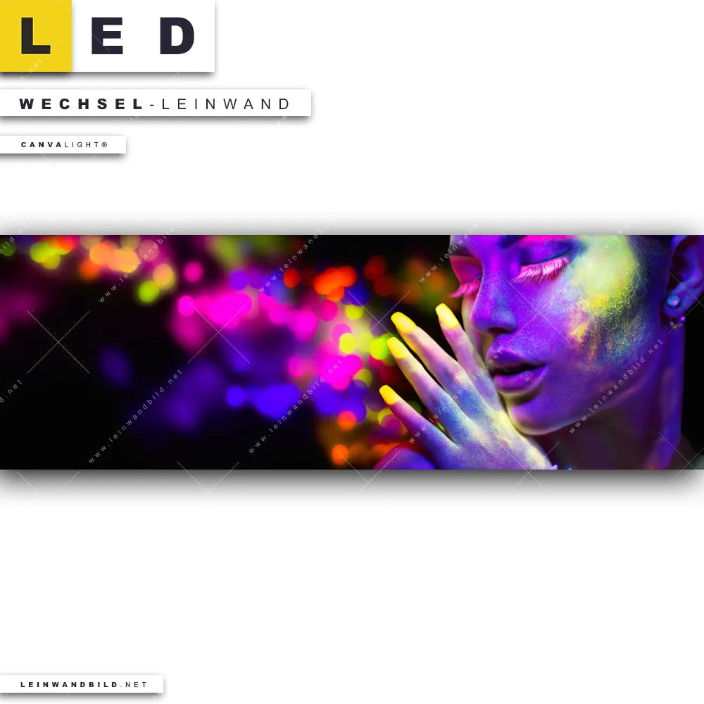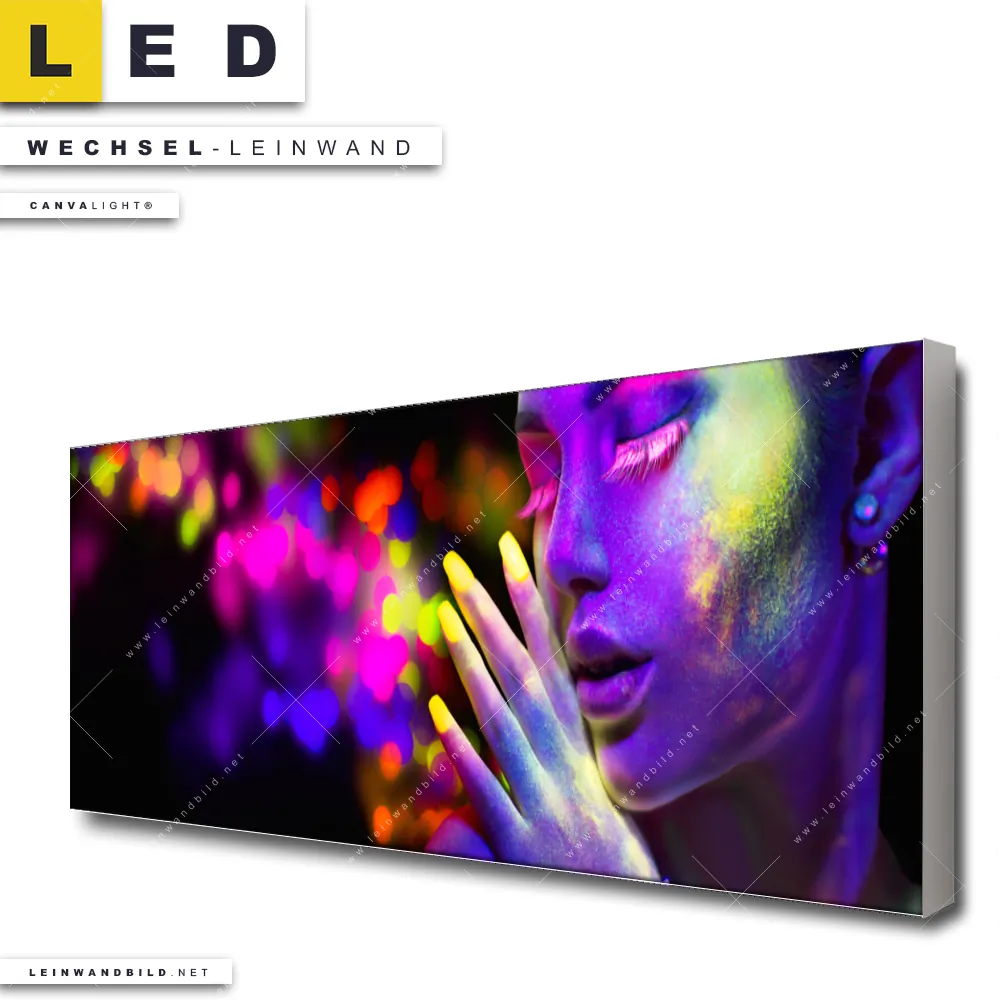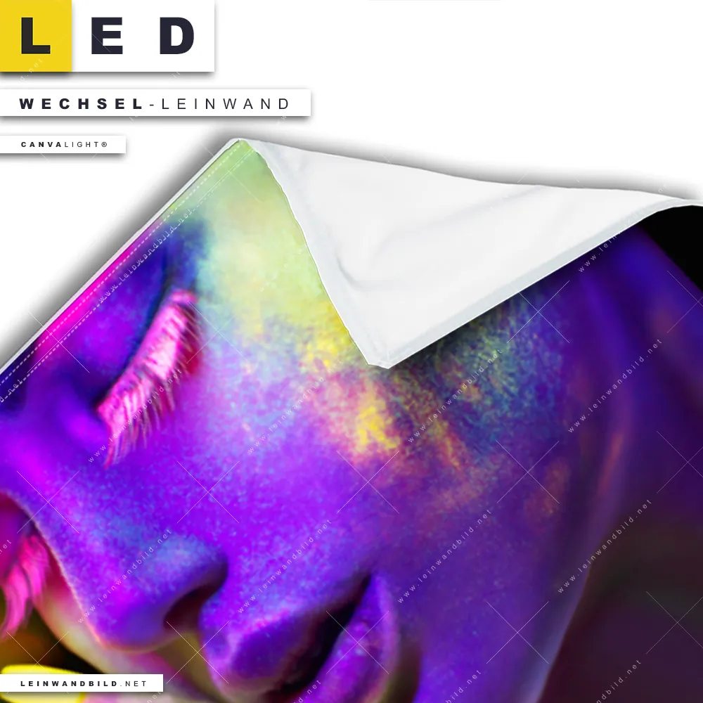 Du bist auf der Suche nach einer Porträts - Menschen Wechsel-Leinwand für Dein LED-Leinwandbild im Panorama-Format? Begriffe wie Frau, Porträt, Farbe, Beauty, Gesicht, Körper, Neon, Neonlicht, Make-up haben Dich auf der Suche nach Deiner Ersatz-Leinwand für dein extra breites LED Wandbild mit wechselbarer Leinwand inspiriert? Farben wie Schwarz, Lila, Pink dürfen auf Deinem neuen Wechselmotiv für Dein XXL Leinwand-LED-Bild nicht fehlen und Leinwände im Modern Art, Pop Art Stil für Leuchtbilder passen perfekt zu Deinem Einrichtungsstil?