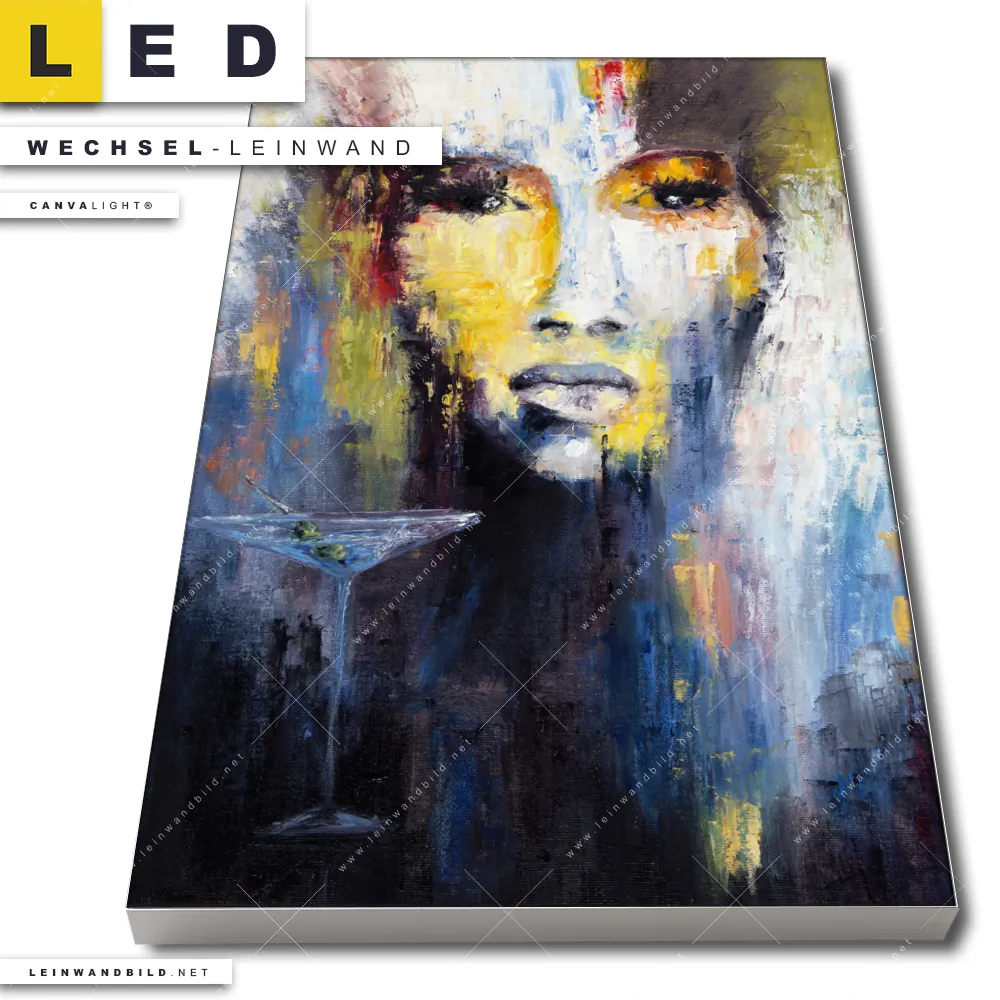 Auf der Suche nach Deinem neuen Wechselmotiv für LED Bilder mit austauschbarer Textil-Leinwand haben Dich Begriffe wie Abstrakt, Modern, Kunst, Gemälde, Ölfarbe, Leinwand, Frau, Portrait, Martini, Cocktail inspiriert? Dann sollte die Wechsel-Leinwand weibliches Gesicht mit Glas für Canvalight® TEX LED Leuchtbilder den Weg zu Dir finden.