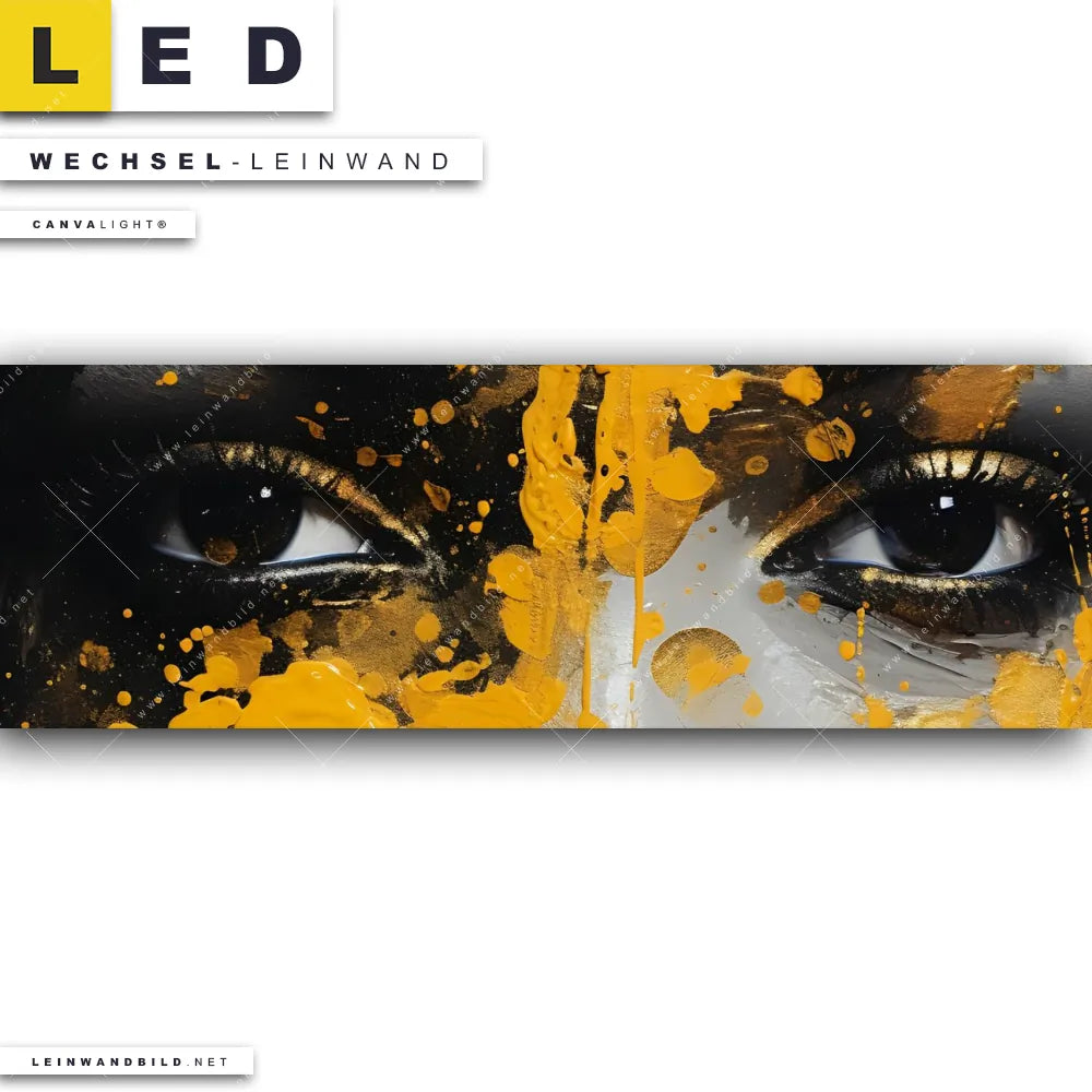 Du bist auf der Suche nach einer Porträts - Menschen Wechsel-Leinwand für Dein LED-Leinwandbild im Panorama-Format? Begriffe wie Gesicht, Farbexplosion, Farbspritzer, Frau, Lippen, Beauty haben Dich auf der Suche nach Deiner Ersatz-Leinwand für dein extra breites LED Wandbild mit wechselbarer Leinwand inspiriert? Farben wie Gold, Orange, Schwarz dürfen auf Deinem neuen Wechselmotiv für Dein XXL Leinwand-LED-Bild nicht fehlen und Leinwände im Abstrakt, Modern Art Stil für Leuchtbilder passen perfekt zu Deinem Einrichtungsstil?