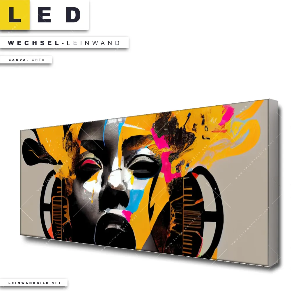 Dann sollte die Wechsel-Leinwand Canvalight® TEX | Frau mit Kopfhörern | Panorama den Weg zu Dir finden. Die Austausch-Leinwand Abstraktes Frauengesicht - passend für unsere stufenlos dimmbaren, steckerfertigen Leinwandbilder im LED Leuchtrahmen mit Fernbedienung und optionaler Farbtemperatursteuerung - fügt sich als Eye-Catcher harmonisch in jedes Wohnzimmer - Schlafzimmer, Bar - Gastronomie, Friseur - Beauty, Flur - Eingangsbereich Raumkonzept ein.