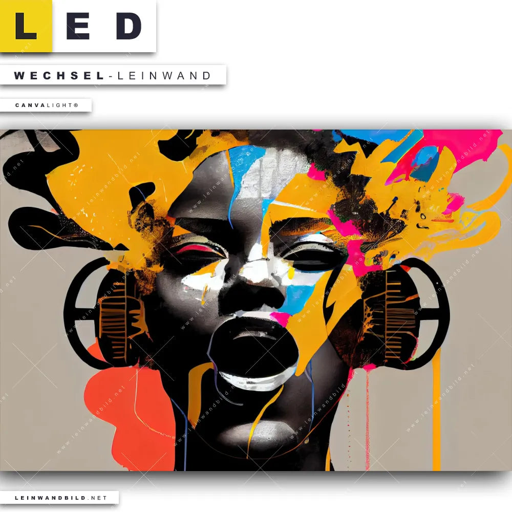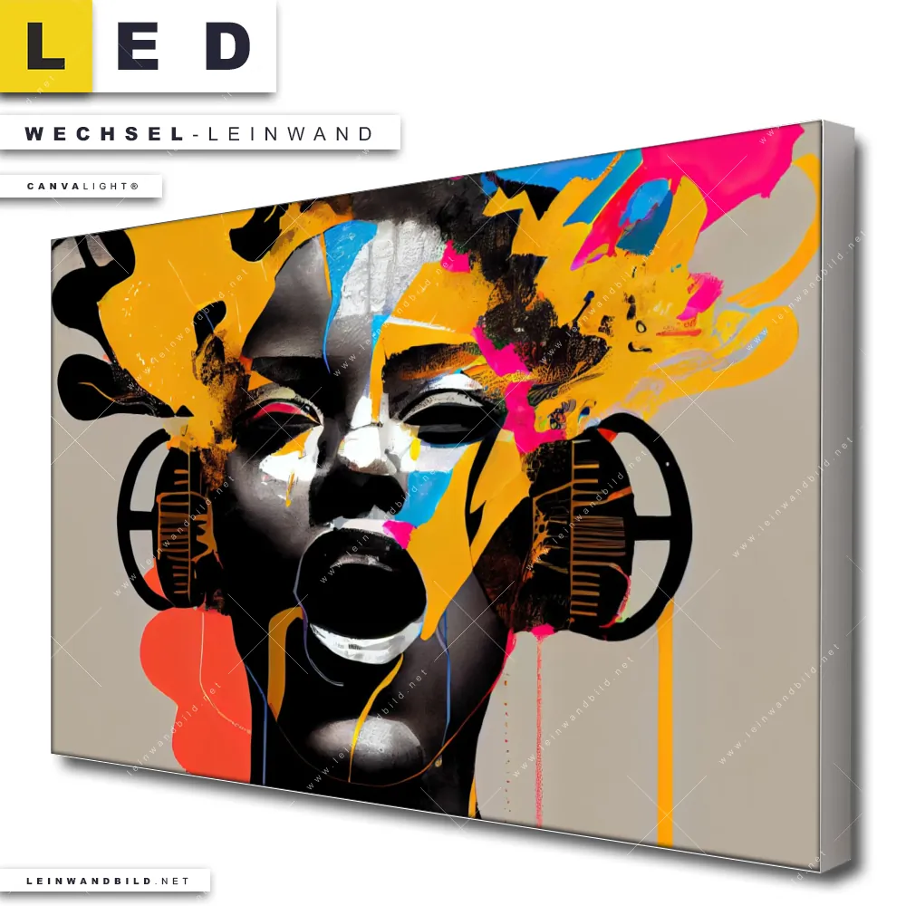 Du bist auf der Suche nach einer Porträts - Menschen Wechsel-Leinwand für Dein LED-Leinwandbild im Querformat? Begriffe wie Frau, Portrait, Gesicht, Mädchen, Dame, Farbe, Musik, Kopfhörer haben Dich auf der Suche nach Deiner Ersatz-Leinwand für dein breites LED Wandbild mit wechselbarer Leinwand inspiriert? Farben wie Beige, Schwarz, Orange, Pink dürfen auf Deinem neuen Wechselmotiv für Dein XXL Leinwand-LED-Bild nicht fehlen und Leinwände im Abstrakt, Modern Art Stil für Leuchtbilder passen perfekt zu Deinem Einrichtungsstil?