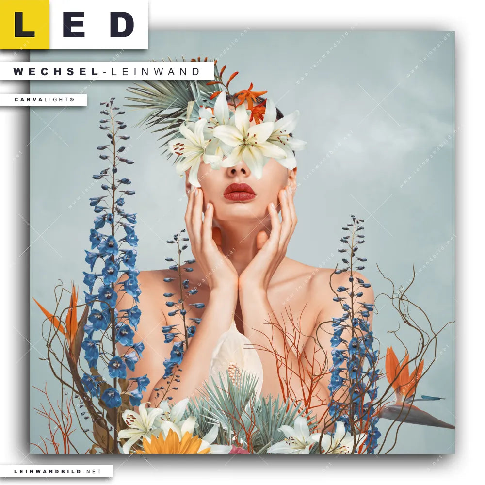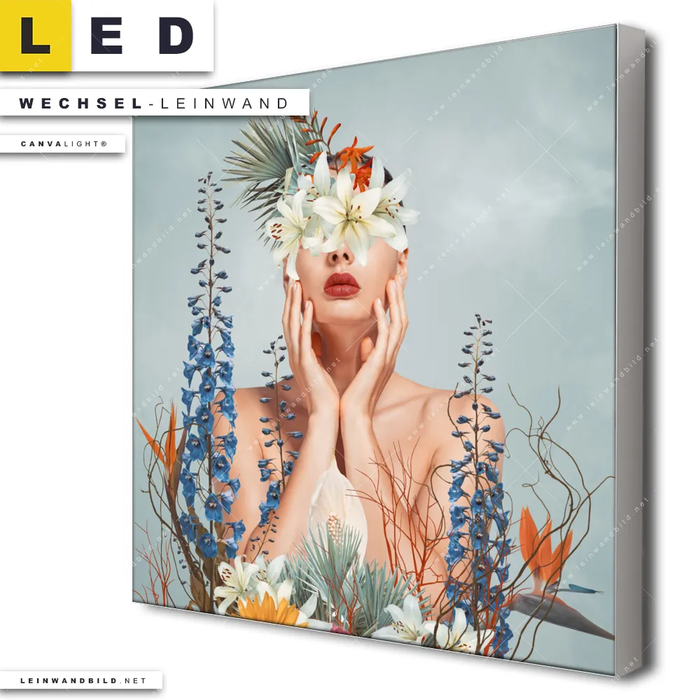 Du bist auf der Suche nach einer Porträts - Menschen, Blumen - Botanik Wechsel-Leinwand für Dein LED-Leinwandbild im Quadratischen Format? Begriffe wie Menschen & Blumen, Frau, Porträt, modern, Beauty, Gesicht, Blumen, Blüten, Schönheit, Mode haben Dich auf der Suche nach Deiner Ersatz-Leinwand für dein LED Wandbild mit wechselbarer Leinwand inspiriert? Farben wie Mint, Beige, Weiss, Blau, Orange dürfen auf Deinem neuen Wechselmotiv für Dein XXL Leinwand-LED-Bild nicht fehlen und Leinwände im Modern Art, Floral Stil für Leuchtbilder passen perfekt zu Deinem Einrichtungsstil?