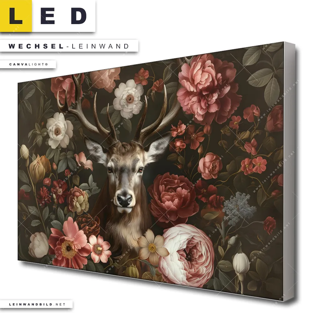 Du bist auf der Suche nach einer Tierwelt, Blumen - Botanik Wechsel-Leinwand für Dein LED-Leinwandbild im Querformat? Begriffe wie Tierporträt, Hirsch, Blüten, Rotwild, Geweih, Blumen, Rothirsch, Pfingstrosen haben Dich auf der Suche nach Deiner Ersatz-Leinwand für dein breites LED Wandbild mit wechselbarer Leinwand inspiriert? Farben wie Braun, Weiss, Rot dürfen auf Deinem neuen Wechselmotiv für Dein XXL Leinwand-LED-Bild nicht fehlen und Leinwände im Retro - Vintage, Floral Stil für Leuchtbilder passen perfekt zu Deinem Einrichtungsstil?