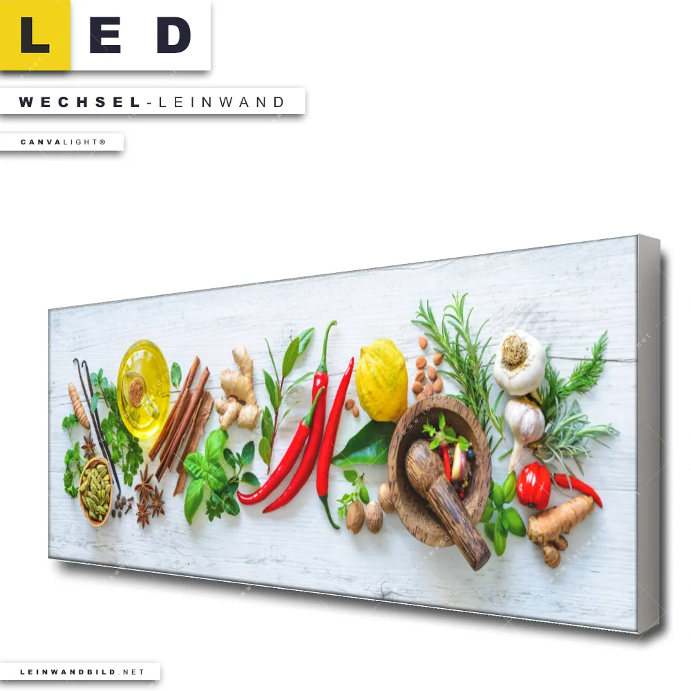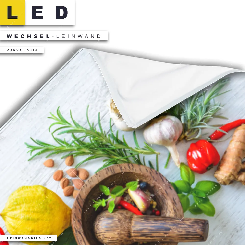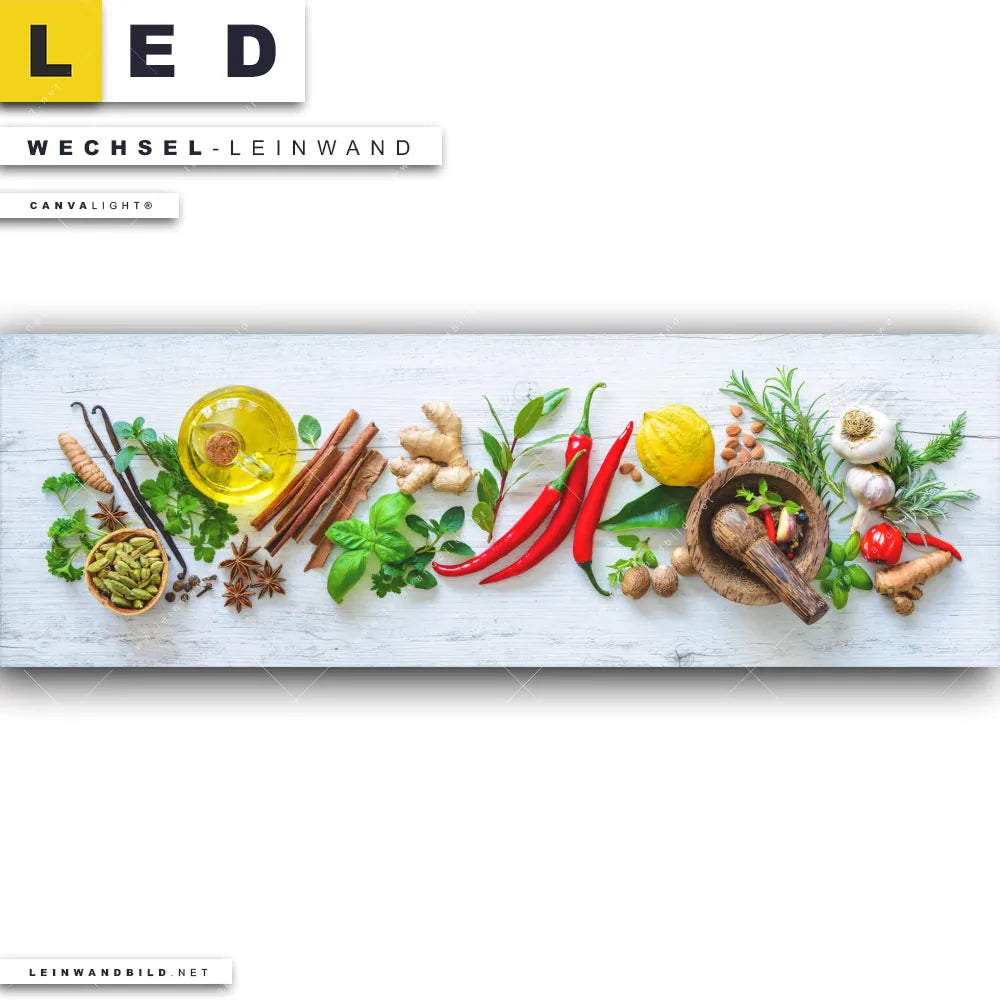Du bist auf der Suche nach einer Essen - Trinken Wechsel-Leinwand für Dein LED-Leinwandbild im Panorama-Format? Begriffe wie Gewürze, Kräuter, kochen, Pfeffer, Curry, Küche, Lebensmittel, gesund, Holz, Brett, Essen haben Dich auf der Suche nach Deiner Ersatz-Leinwand für dein extra breites LED Wandbild mit wechselbarer Leinwand inspiriert? Farben wie Weiss, Grün, Rot, Gelb , Braun dürfen auf Deinem neuen Wechselmotiv für Dein XXL Leinwand-LED-Bild nicht fehlen und Leinwände im Modern Art, Natürlich - Realistisch Stil für Leuchtbilder passen perfekt zu Deinem Einrichtungsstil?