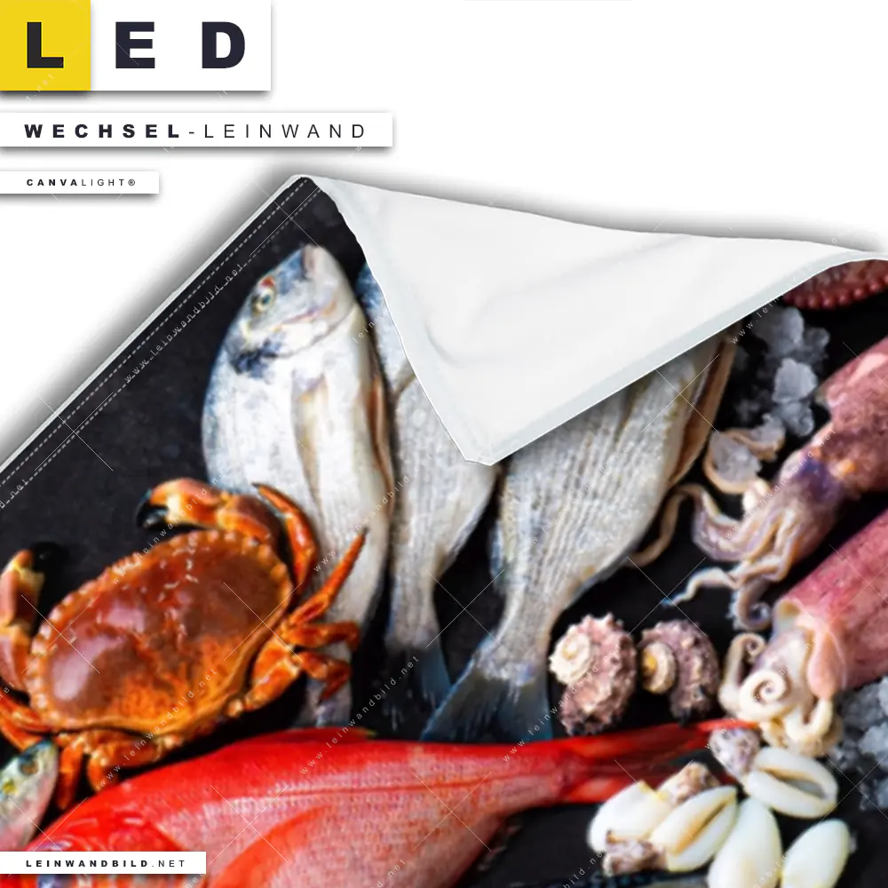 LED Wechsel-Leinwand Canvalight® TEX | Frischer Fisch und Meeresfrüchte | Panorama