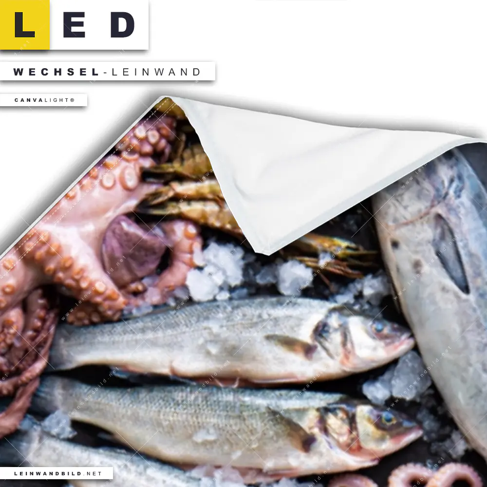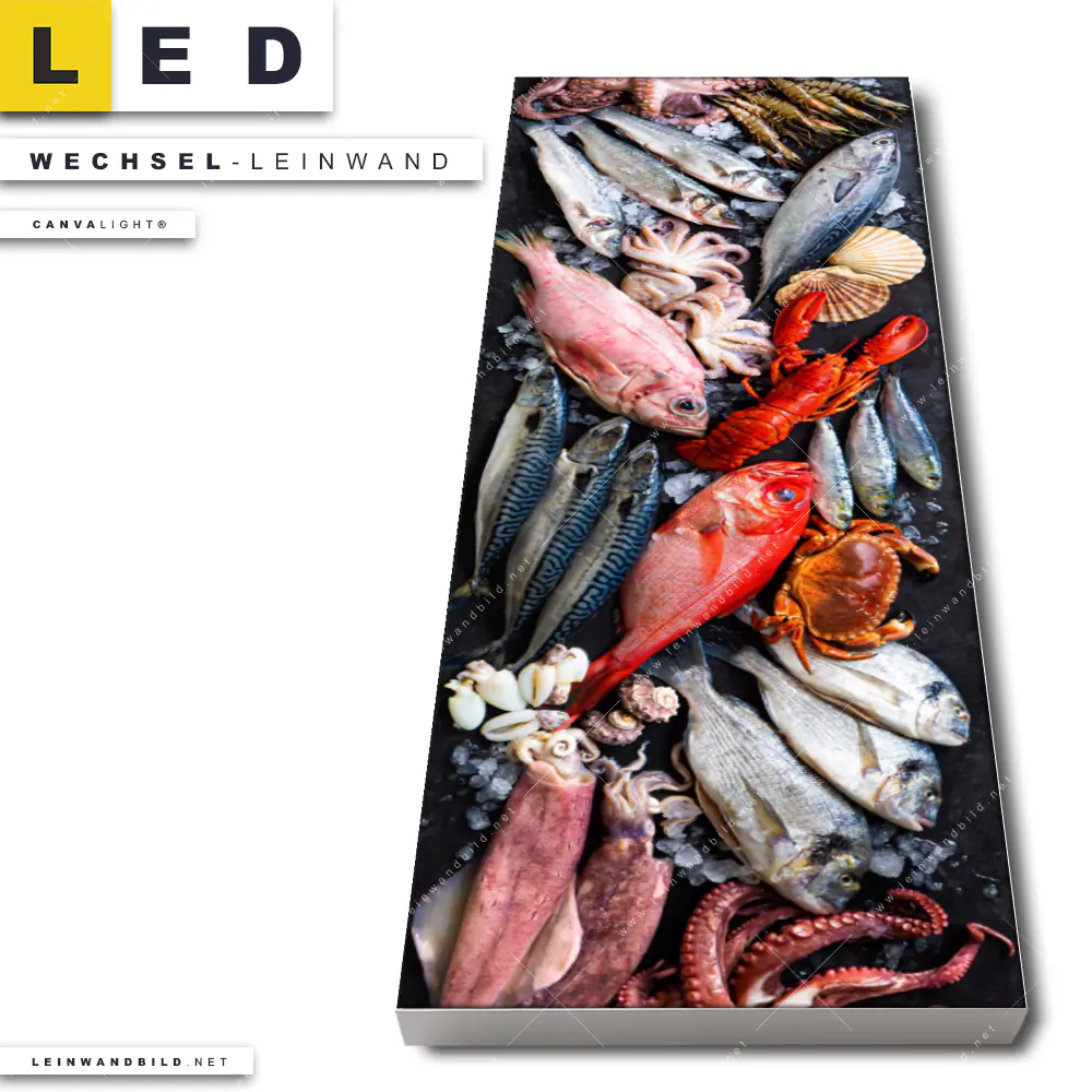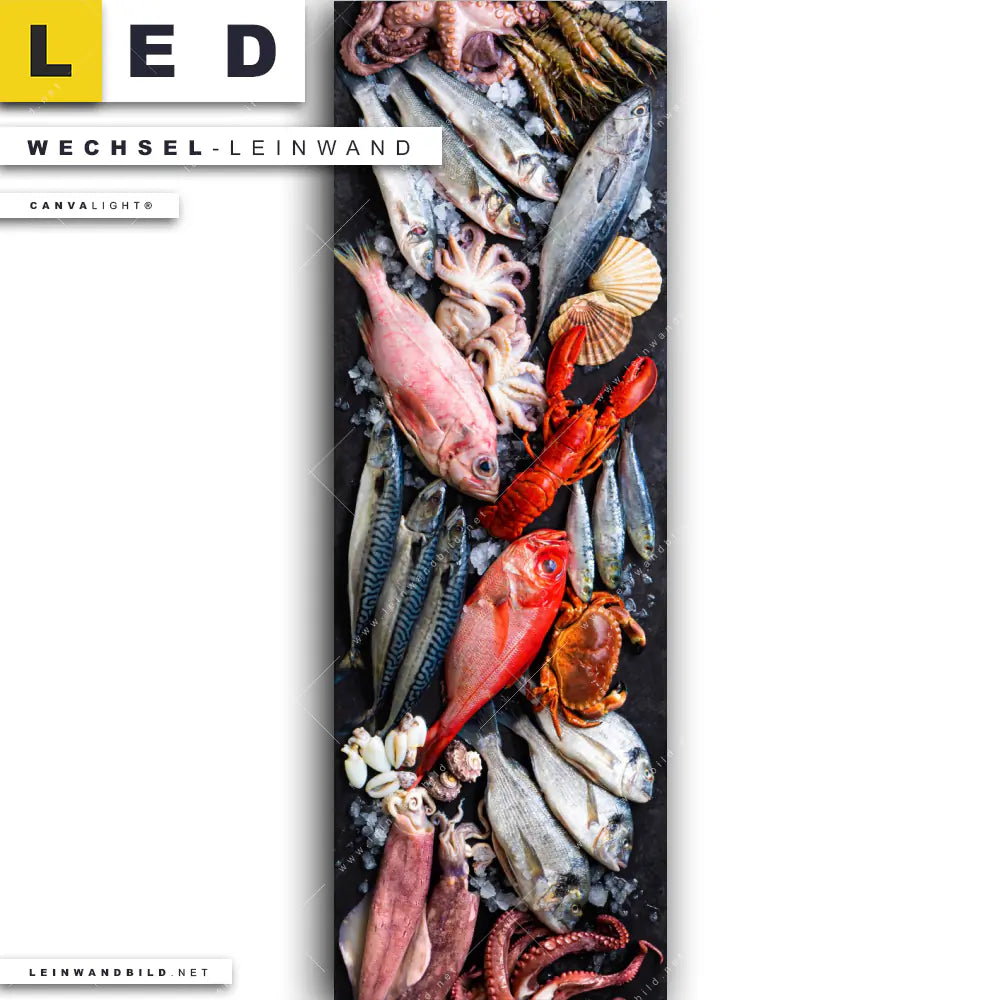 LED Wechsel-Leinwand Canvalight® TEX | Frischer Fisch und Meeresfrüchte | Schmal