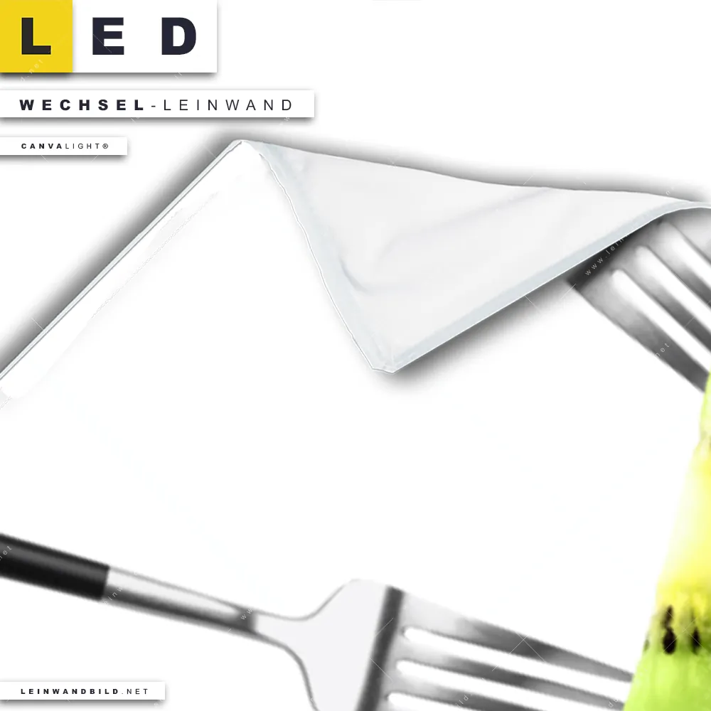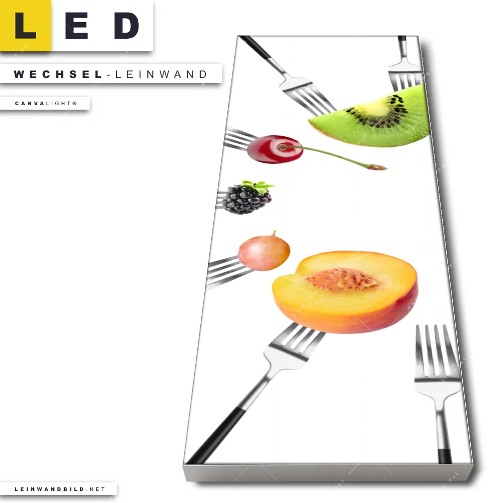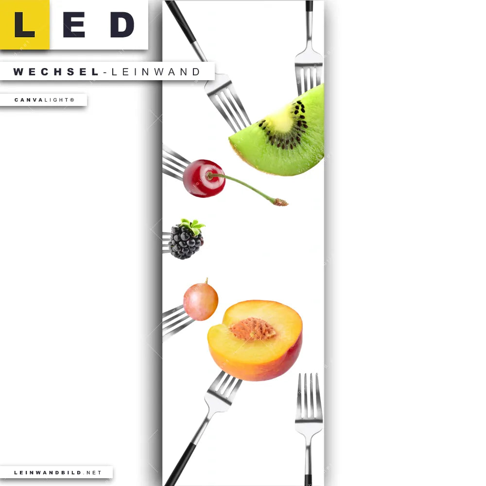 Du konfigurierst Deine individuelle LED Wechsel-Leinwand Canvalight® TEX | Früchte auf Gabeln | Schmal und wir produzieren sie NEU für Dich. Unsere Essen - Trinken Austausch-Fotoleinwände für Canvalight® LED Bilder sind KEINE Lagerware. Du bist Dir unsicher, welches Motiv oder Format das richtige für dein individuelles LED Wechselmotiv auf Leinwand ist, dann helfen wir dir gerne weiter und beraten dich!