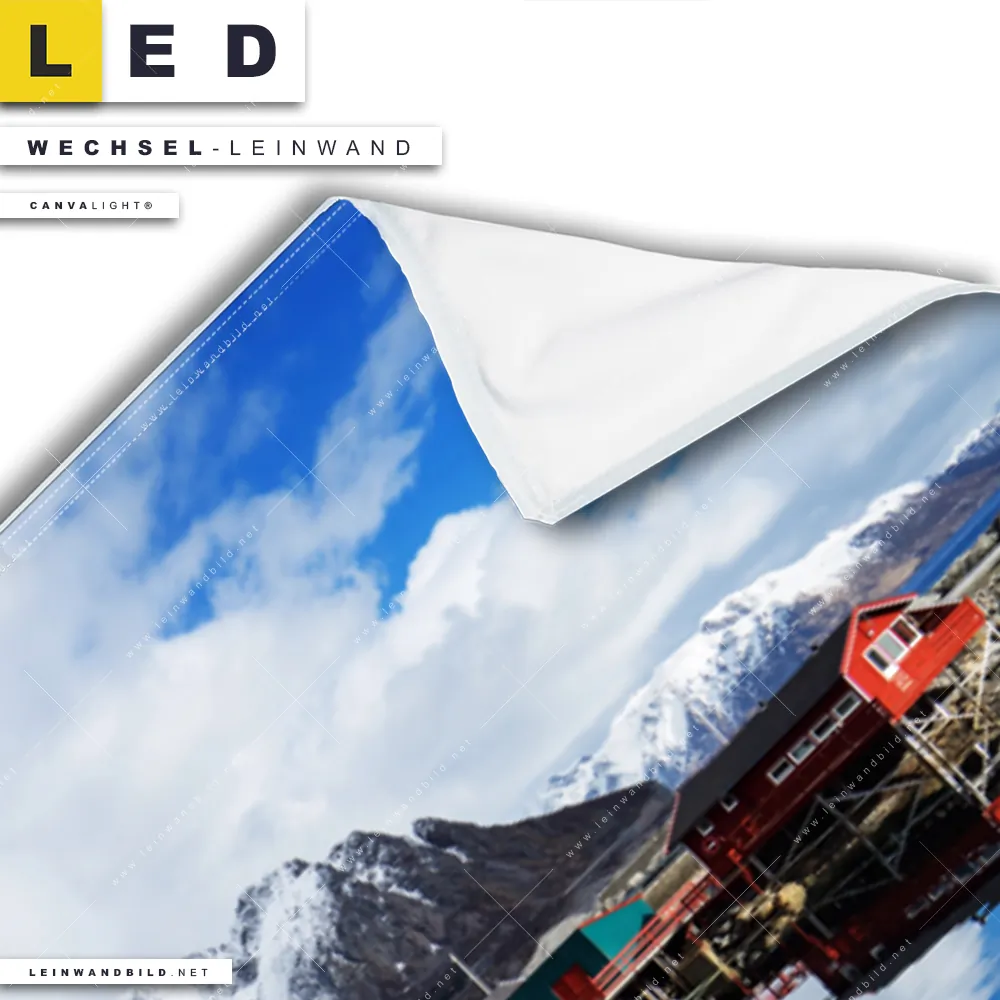 Bitte beachte, dass die Farben, der auf dem Monitor abgebildeten Fischerdorf am norwegischen Fjord Darstellung, möglicherweise von den Originalfarben deiner Canvalight® TEX Wechsel-Leinwand abweichen können.