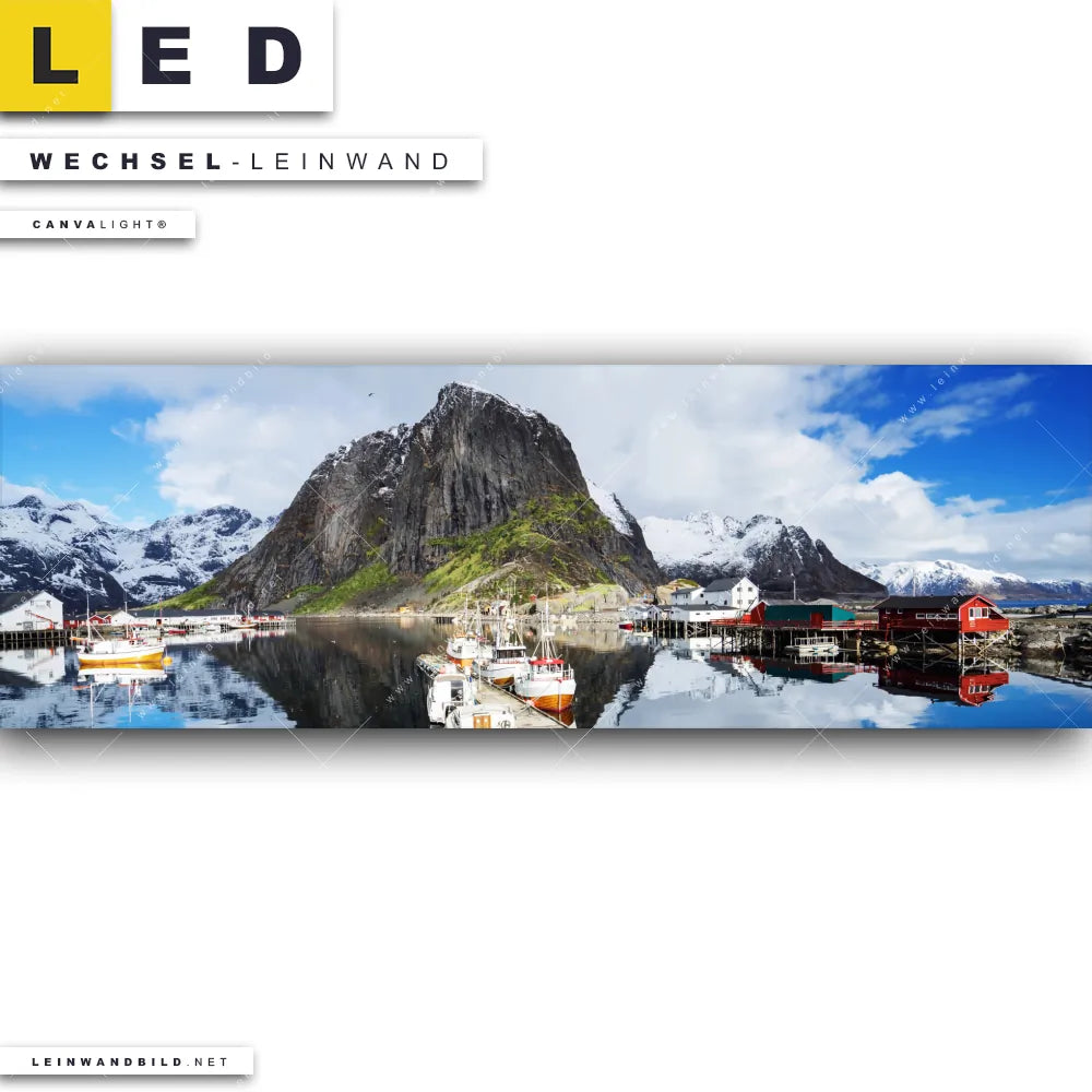 Du bist auf der Suche nach einer Landschaften, Städte - Skylines Wechsel-Leinwand für Dein LED-Leinwandbild im Panorama-Format? Begriffe wie Skandinavien, Norwegen, Haus, Boot, Berg, See, Frühling, Natur, Dorf, Steg haben Dich auf der Suche nach Deiner Ersatz-Leinwand für dein extra breites LED Wandbild mit wechselbarer Leinwand inspiriert? Farben wie Blau, Rot, Weiss, Hellgrün dürfen auf Deinem neuen Wechselmotiv für Dein XXL Leinwand-LED-Bild nicht fehlen und Leinwände im Natürlich - Realistisch Stil für Leuchtbilder passen perfekt zu Deinem Einrichtungsstil?