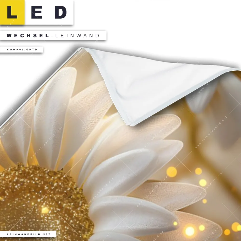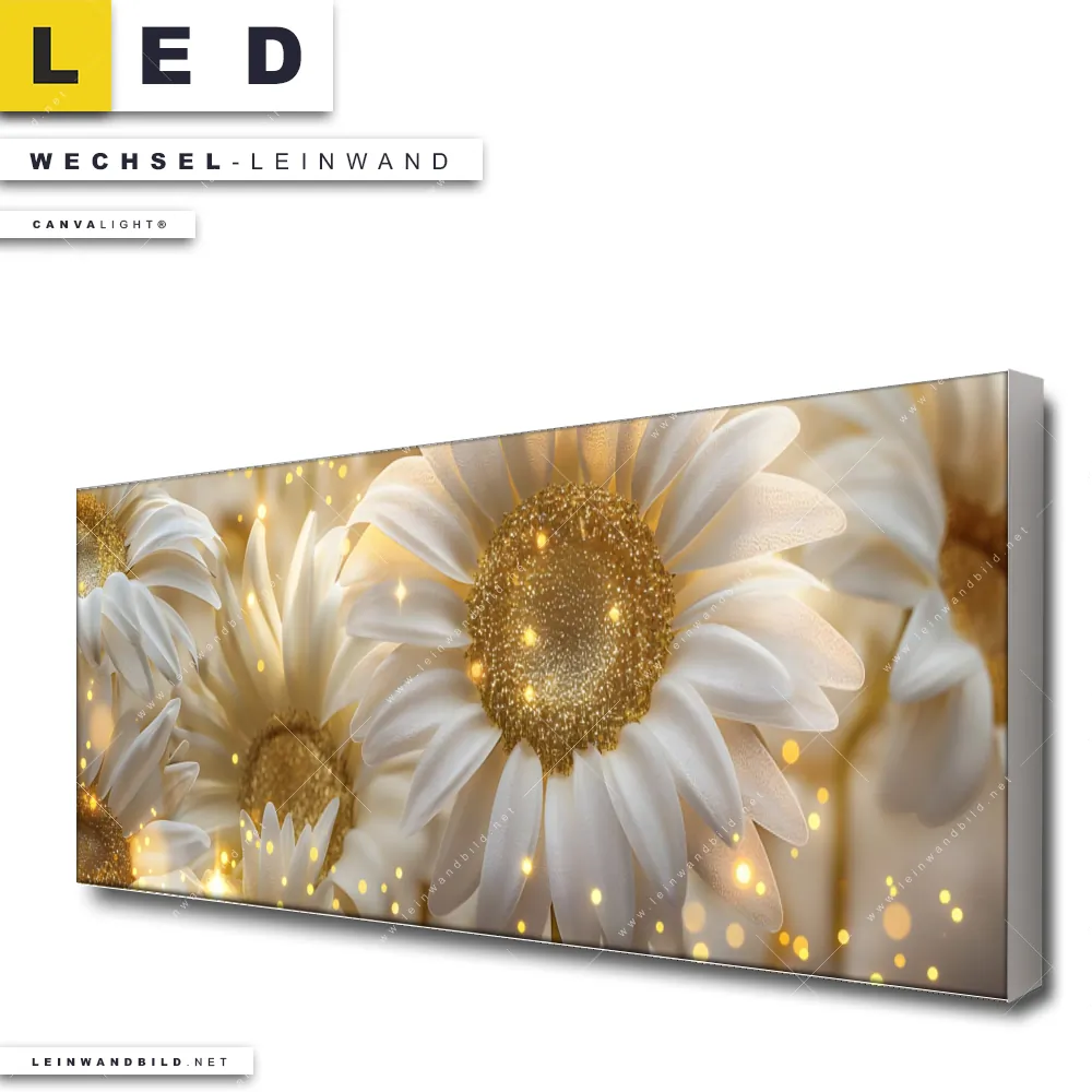 Du bist auf der Suche nach einer Blumen - Botanik Wechsel-Leinwand für Dein LED-Leinwandbild im Panorama-Format? Begriffe wie Gänseblümchen, Blüten, Natur, Pflanze, Glitzer, Blütenmeer haben Dich auf der Suche nach Deiner Ersatz-Leinwand für dein extra breites LED Wandbild mit wechselbarer Leinwand inspiriert? Farben wie Weiss, Gold dürfen auf Deinem neuen Wechselmotiv für Dein XXL Leinwand-LED-Bild nicht fehlen und Leinwände im Floral, Modern Art Stil für Leuchtbilder passen perfekt zu Deinem Einrichtungsstil?