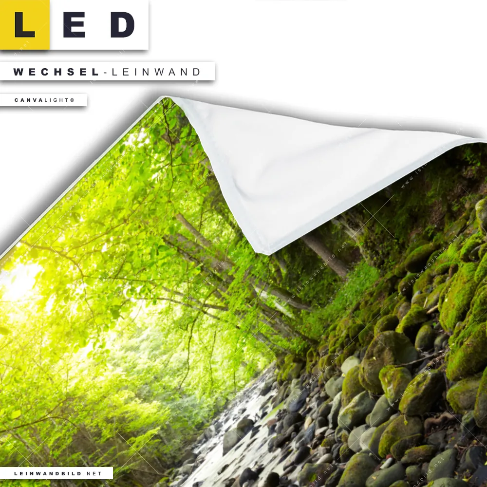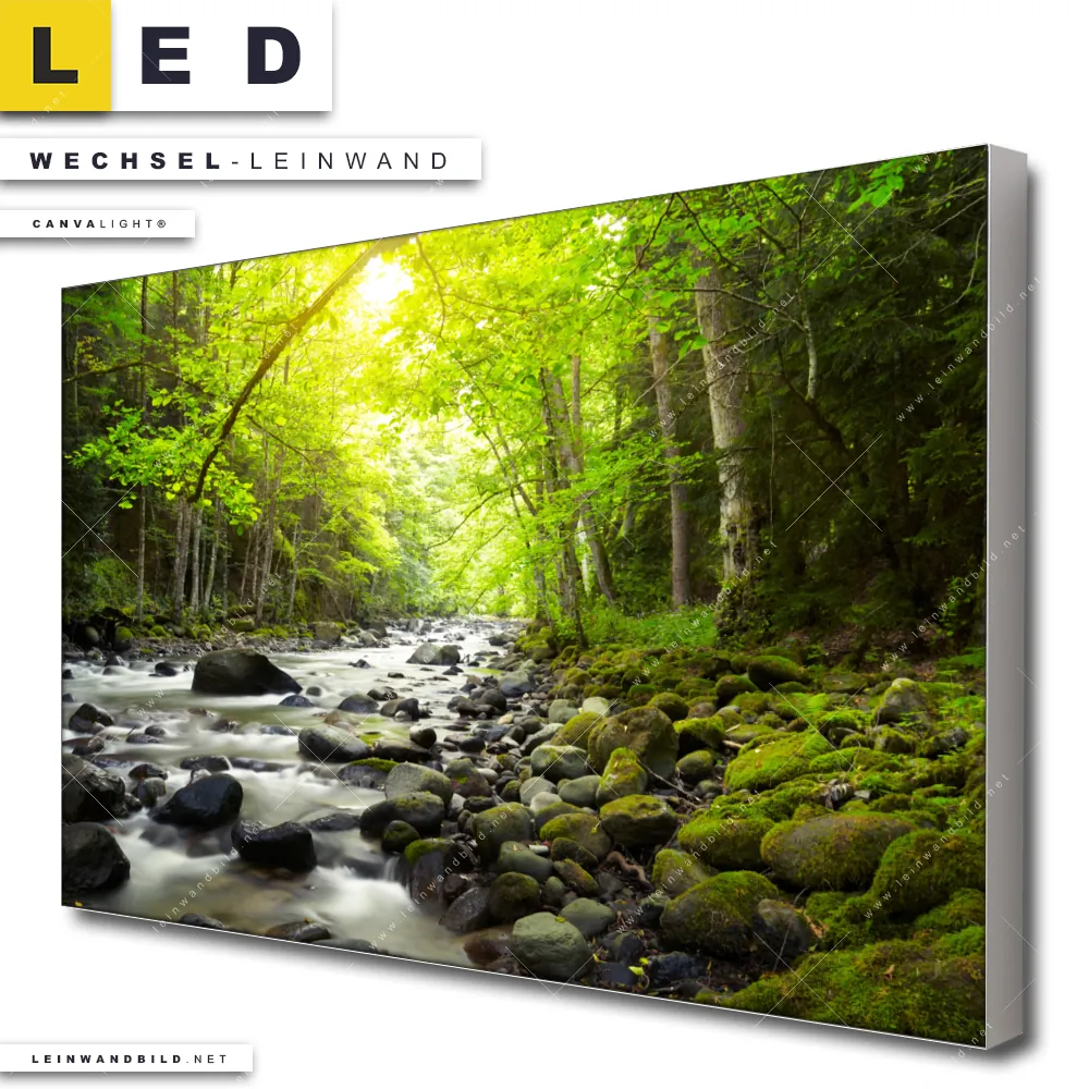 LED Wechsel-Leinwand Canvalight® TEX | Gebirgsfluss im Wald | Querformat
