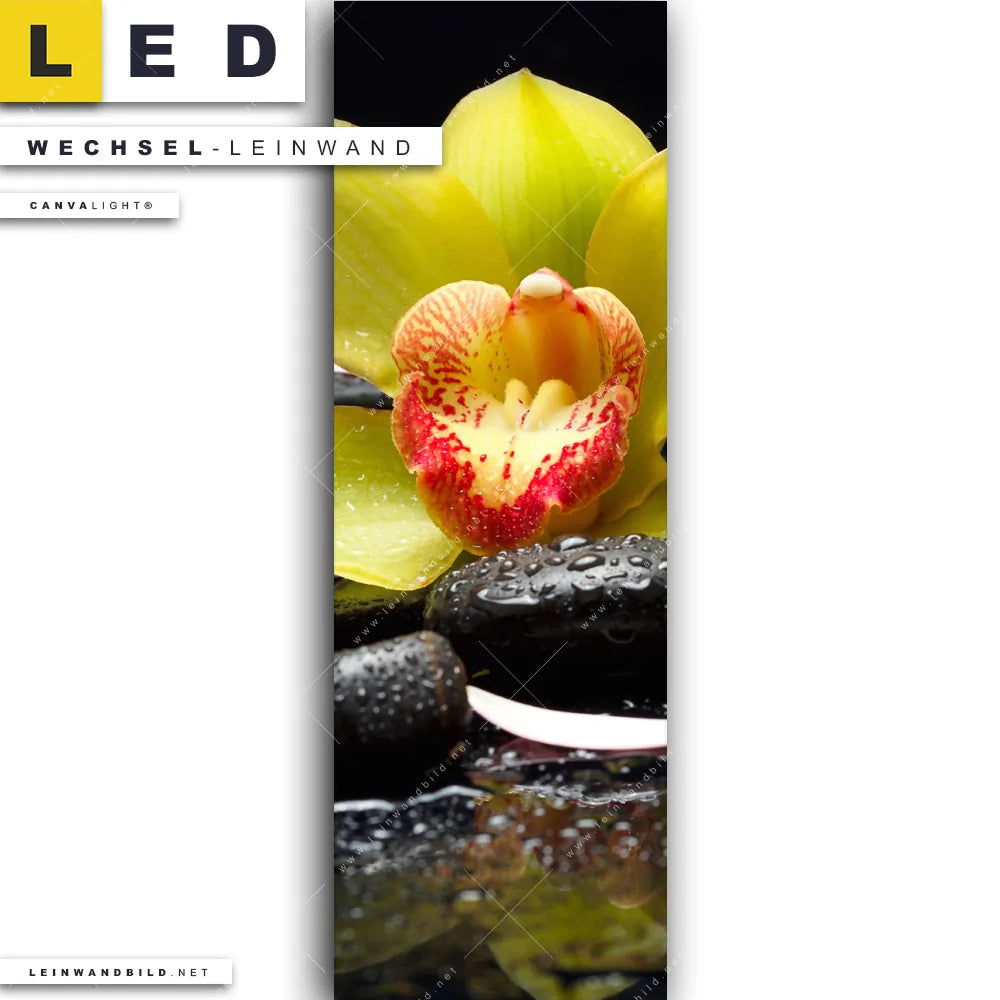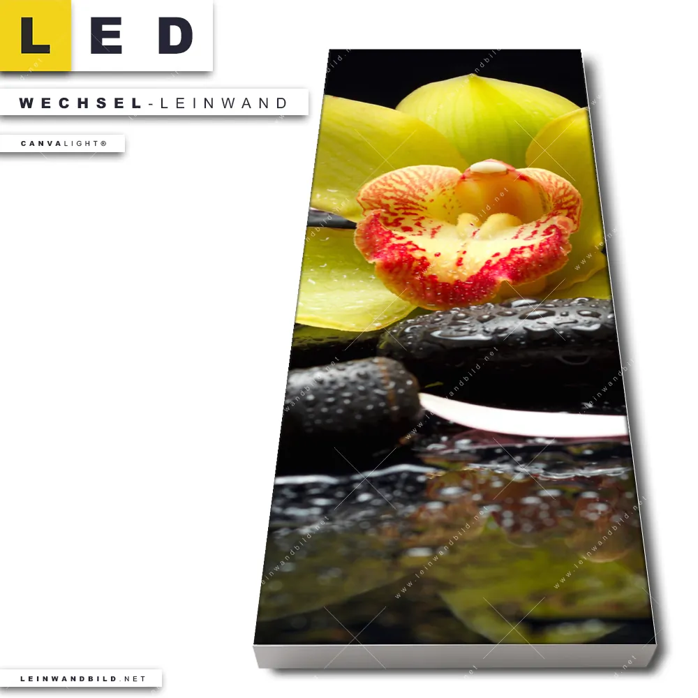 Dann sollte die Wechsel-Leinwand Canvalight® TEX | Gelbe Orchidee | Schmal den Weg zu Dir finden. Die Austausch-Leinwand Steine mit Wassertropfen und gelber Blüte - passend für unsere stufenlos dimmbaren, steckerfertigen Leinwandbilder im LED Leuchtrahmen mit Fernbedienung und optionaler Farbtemperatursteuerung - fügt sich als Eye-Catcher harmonisch in jedes Arzt - Praxis, Flur - Eingangsbereich, Friseur - Beauty, Küche - Esszimmer, Wohnzimmer - Schlafzimmer Raumkonzept ein.
