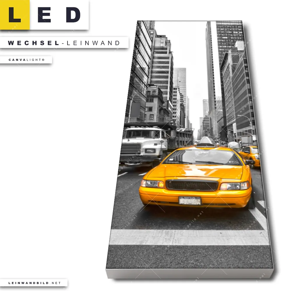 Du konfigurierst Deine individuelle LED Wechsel-Leinwand Canvalight® TEX | Gelbe Taxis New York | Schmal und wir produzieren sie NEU für Dich. Unsere Fahrzeuge, Städte - Skylines Austausch-Fotoleinwände für Canvalight® LED Bilder sind KEINE Lagerware. Du bist Dir unsicher, welches Motiv oder Format das richtige für dein individuelles LED Wechselmotiv auf Leinwand ist, dann helfen wir dir gerne weiter und beraten dich!