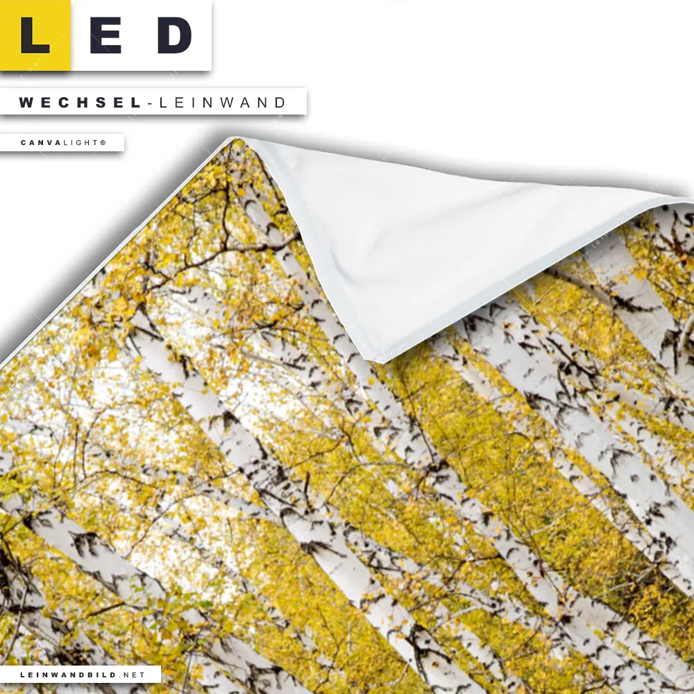 Du konfigurierst Deine individuelle LED Wechsel-Leinwand Canvalight® TEX | Gelber Birkenwald | Hochformat und wir produzieren sie NEU für Dich. Unsere Landschaften, Wald - Bäume Austausch-Fotoleinwände für Canvalight® LED Bilder sind KEINE Lagerware. Du bist Dir unsicher, welches Motiv oder Format das richtige für dein individuelles LED Wechselmotiv auf Leinwand ist, dann helfen wir dir gerne weiter und beraten dich!