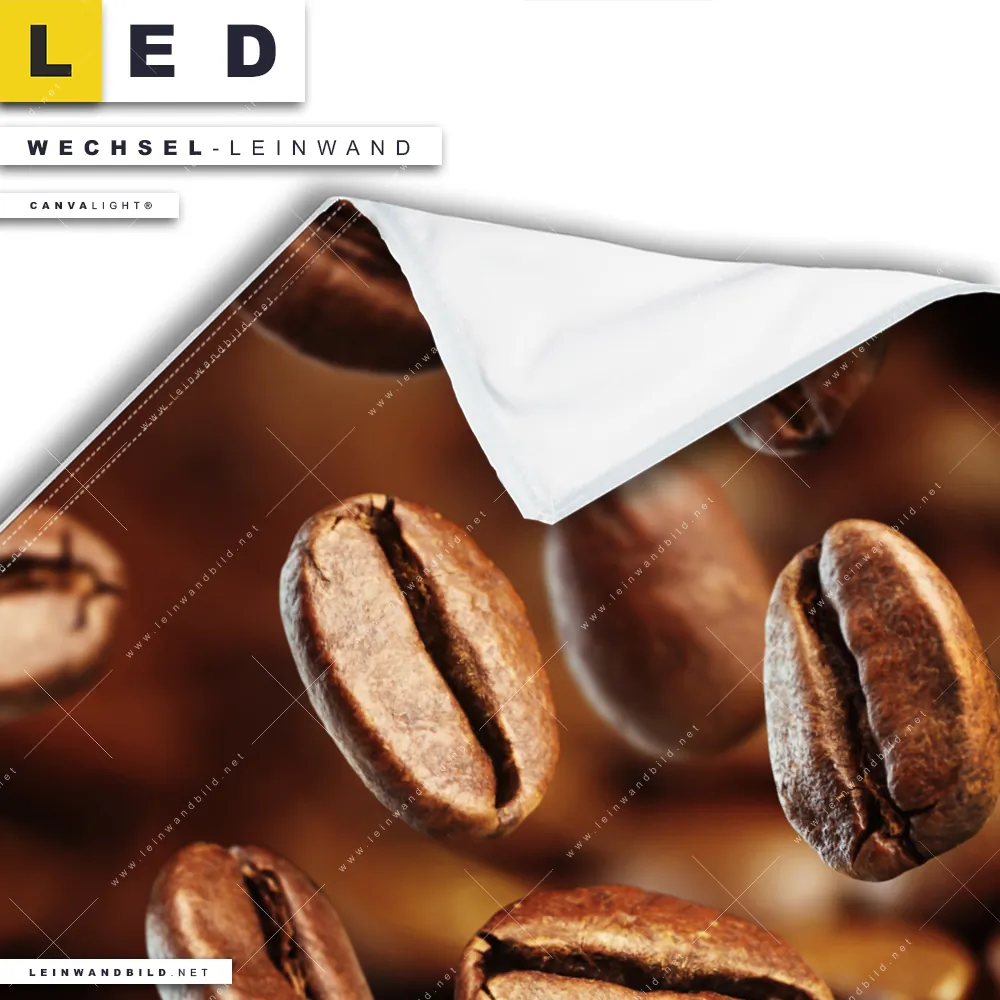 Bitte beachte, dass die Farben, der auf dem Monitor abgebildeten Kaffeewelt - Frische Bohnen Darstellung, möglicherweise von den Originalfarben deiner Canvalight® TEX Wechsel-Leinwand abweichen können.