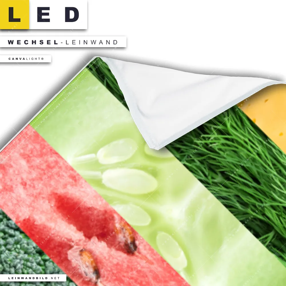 Du konfigurierst Deine individuelle LED Wechsel-Leinwand Canvalight® TEX | Gesunde Ernährung | Panorama und wir produzieren sie NEU für Dich. Unsere Essen - Trinken Austausch-Fotoleinwände für Canvalight® LED Bilder sind KEINE Lagerware. Du bist Dir unsicher, welches Motiv oder Format das richtige für dein individuelles LED Wechselmotiv auf Leinwand ist, dann helfen wir dir gerne weiter und beraten dich!