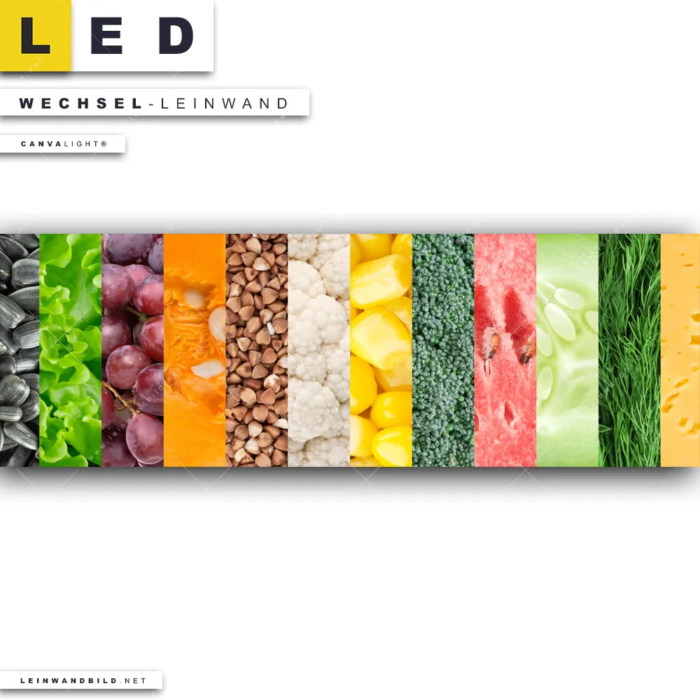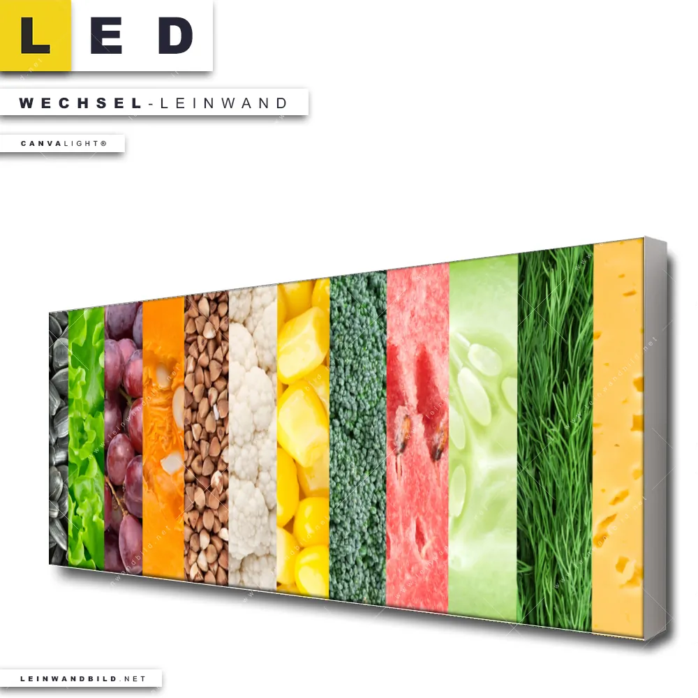 Dann sollte die Wechsel-Leinwand Canvalight® TEX | Gesunde Ernährung | Panorama den Weg zu Dir finden. Die Austausch-Leinwand bunte Nahrungsmittel in Streifen - passend für unsere stufenlos dimmbaren, steckerfertigen Leinwandbilder im LED Leuchtrahmen mit Fernbedienung und optionaler Farbtemperatursteuerung - fügt sich als Eye-Catcher harmonisch in jedes Bar - Gastronomie, Küche - Esszimmer Raumkonzept ein.
