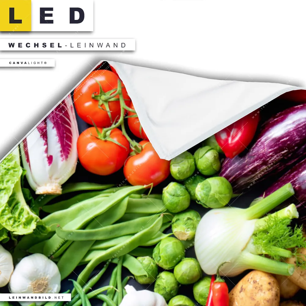 Du konfigurierst Deine individuelle LED Wechsel-Leinwand Canvalight® TEX | Gesundes Gemüse | Quadrat und wir produzieren sie NEU für Dich. Unsere Essen - Trinken Austausch-Fotoleinwände für Canvalight® LED Bilder sind KEINE Lagerware. Du bist Dir unsicher, welches Motiv oder Format das richtige für dein individuelles LED Wechselmotiv auf Leinwand ist, dann helfen wir dir gerne weiter und beraten dich!