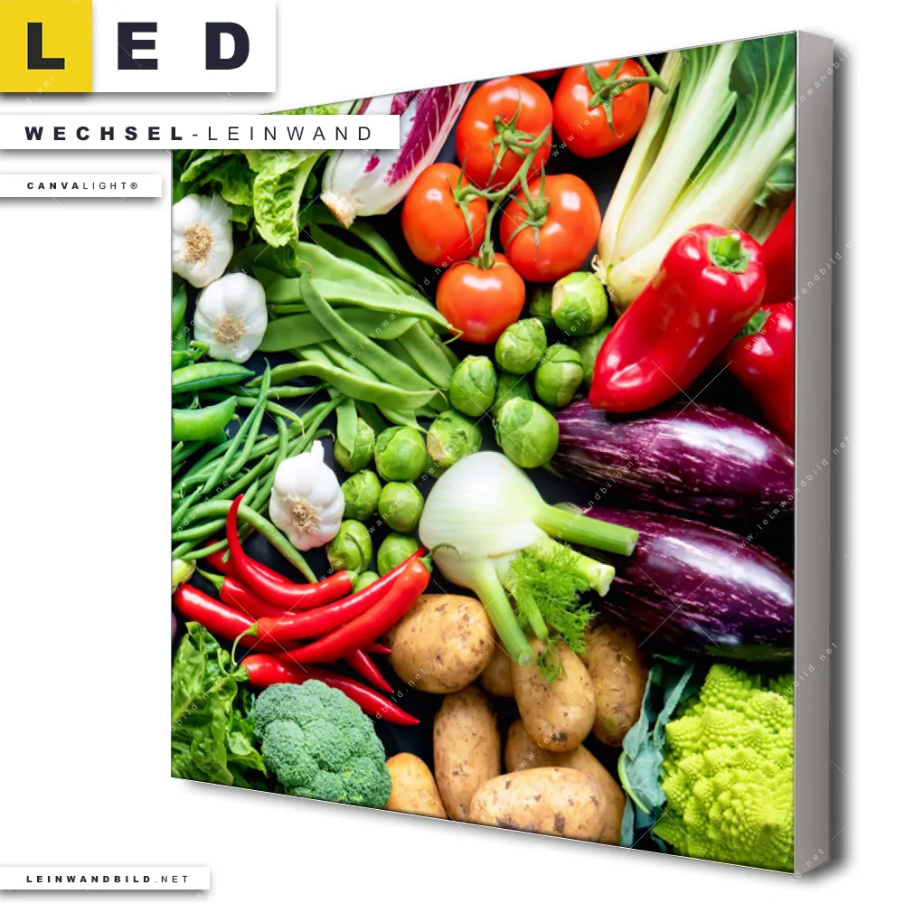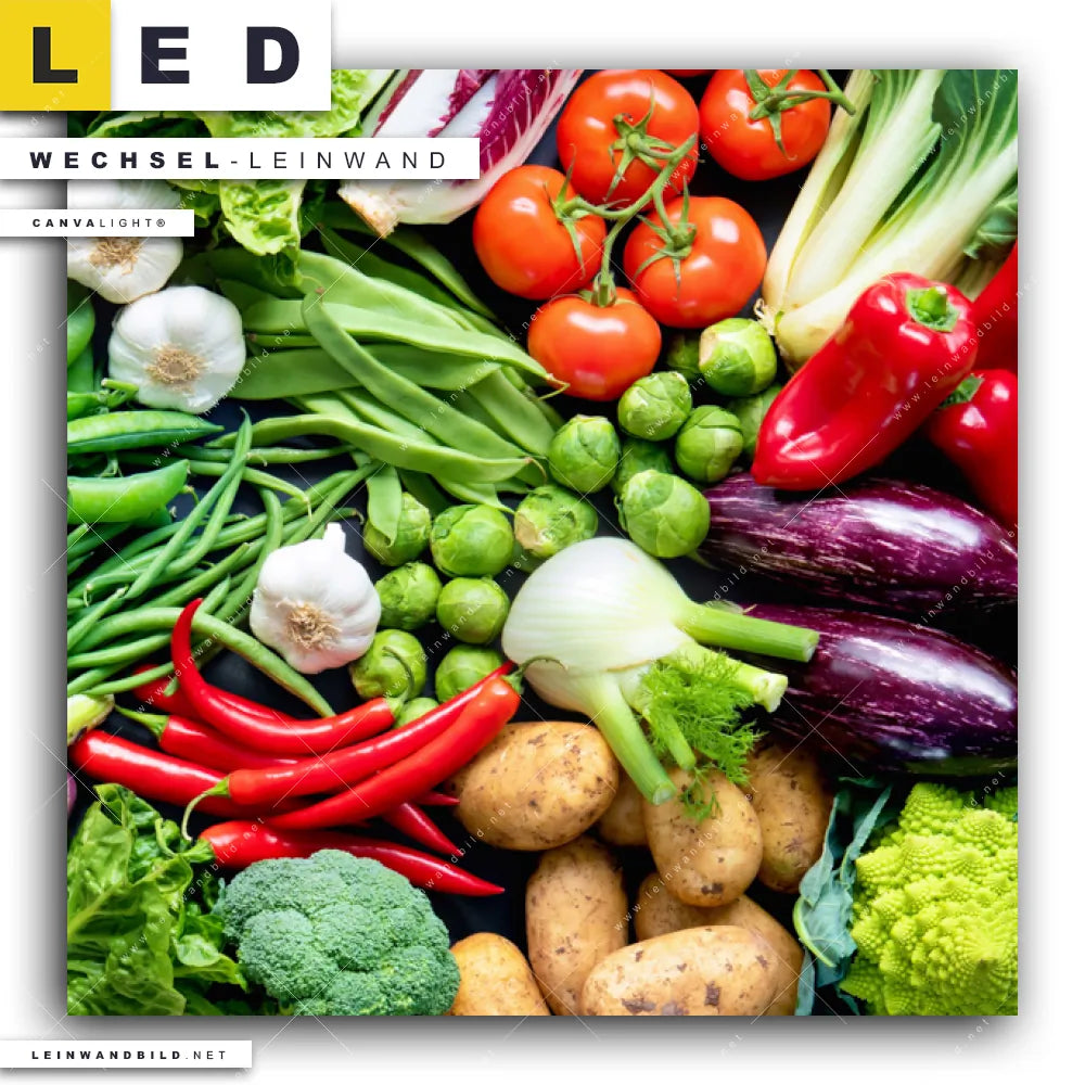 Du bist auf der Suche nach einer Essen - Trinken Wechsel-Leinwand für Dein LED-Leinwandbild im Quadratischen Format? Begriffe wie Gemüse, Essen, gesund, Nahrung, Lebensmittel, Ernährung, Küche, Kochen, Gesundheit haben Dich auf der Suche nach Deiner Ersatz-Leinwand für dein LED Wandbild mit wechselbarer Leinwand inspiriert? Farben wie Grün, Hellgrün, Lila, Rot, Orange dürfen auf Deinem neuen Wechselmotiv für Dein XXL Leinwand-LED-Bild nicht fehlen und Leinwände im Natürlich - Realistisch Stil für Leuchtbilder passen perfekt zu Deinem Einrichtungsstil?