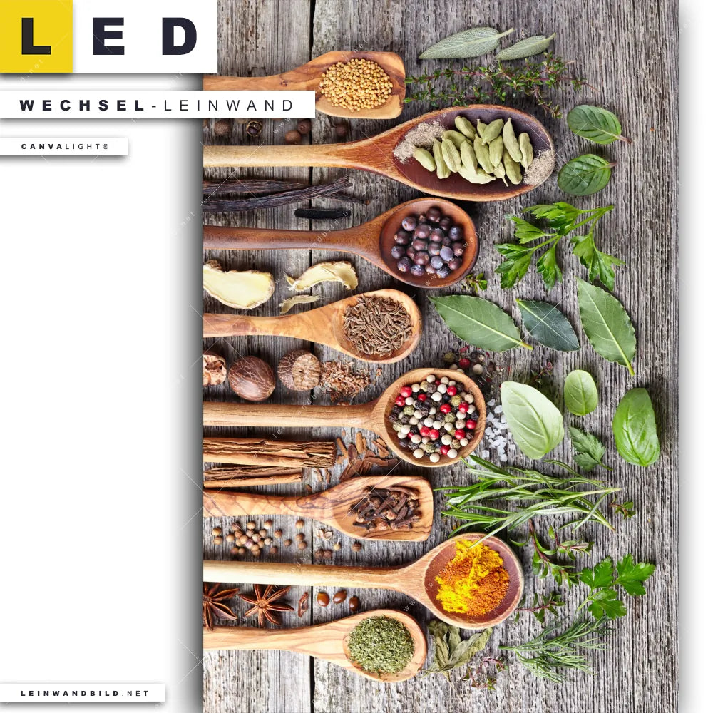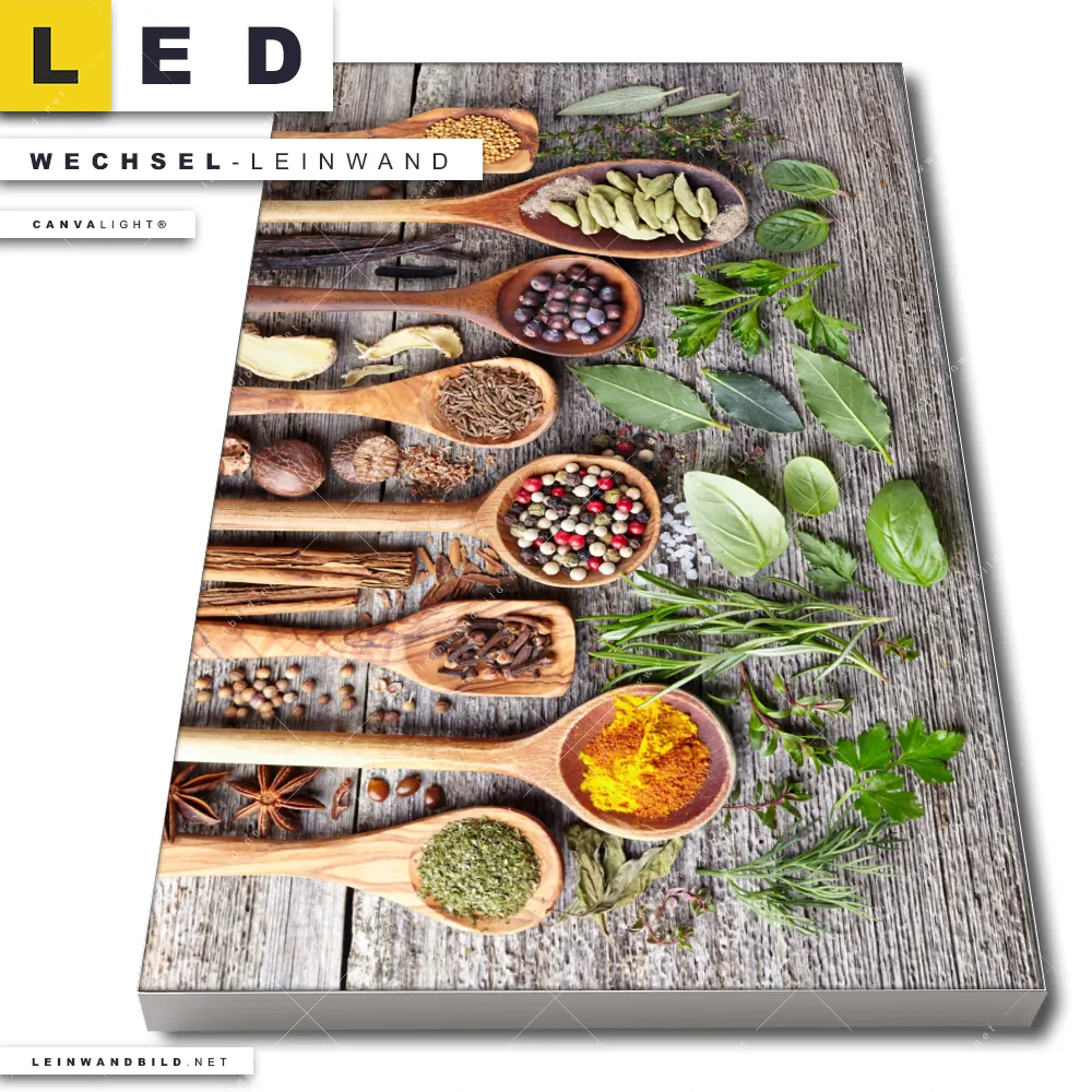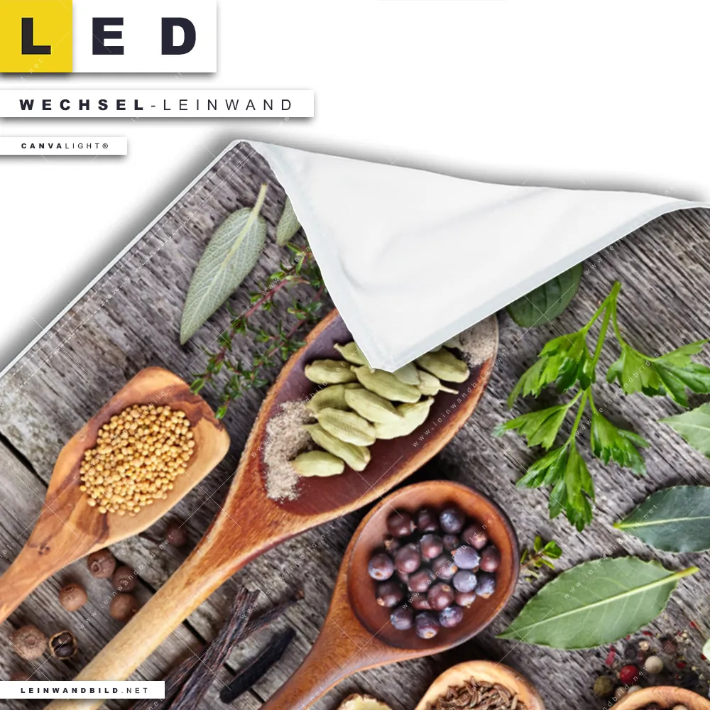 LED Wechsel-Leinwand Canvalight® TEX | Gewürze auf Holzlöffeln | Hochformat