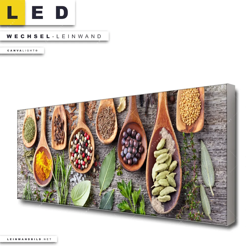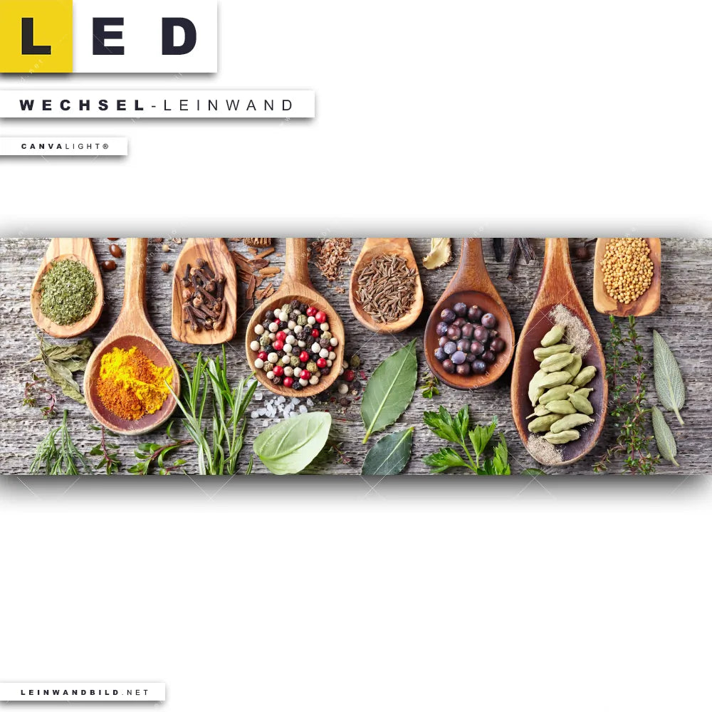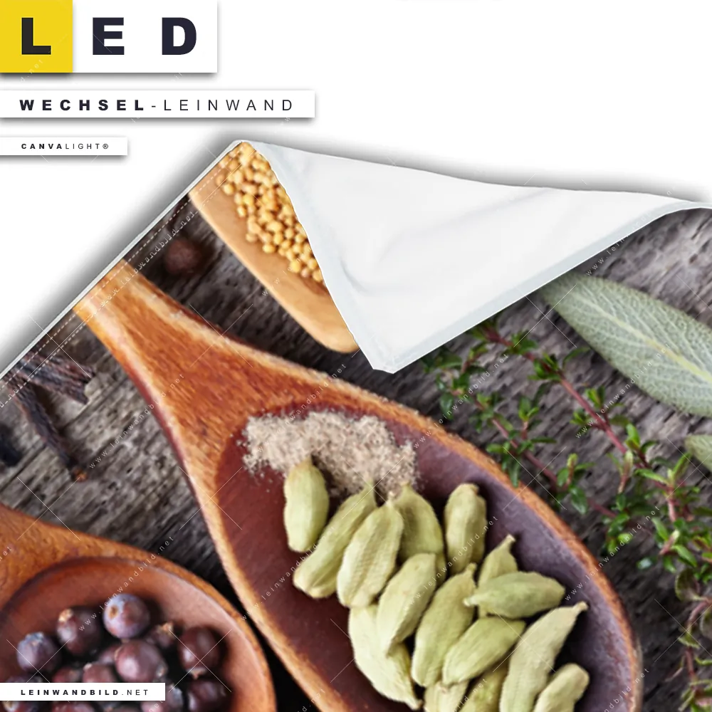 Du bist auf der Suche nach einer Essen - Trinken Wechsel-Leinwand für Dein LED-Leinwandbild im Panorama-Format? Begriffe wie Gewürze, Kräuter, Löffel, kochen, Pfeffer, Curry, Holzlöffel, Küche, Lebensmittel, gesund, Holz, Brett haben Dich auf der Suche nach Deiner Ersatz-Leinwand für dein extra breites LED Wandbild mit wechselbarer Leinwand inspiriert? Farben wie Braun, Grün, Rot, Gelb dürfen auf Deinem neuen Wechselmotiv für Dein XXL Leinwand-LED-Bild nicht fehlen und Leinwände im Modern Art, Natürlich - Realistisch Stil für Leuchtbilder passen perfekt zu Deinem Einrichtungsstil?