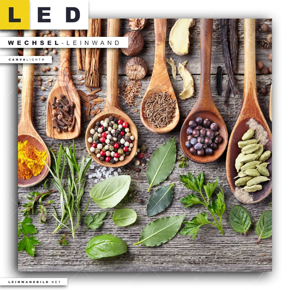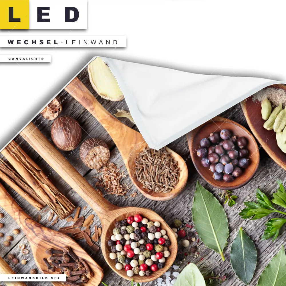 Dann sollte die Wechsel-Leinwand Canvalight® TEX | Gewürze auf Holzlöffeln | Quadrat den Weg zu Dir finden. Die Austausch-Leinwand Gewürze mit grünen Kräutern - passend für unsere stufenlos dimmbaren, steckerfertigen Leinwandbilder im Leuchtrahmen mit Fernbedienung und optionaler Farbtemperatursteuerung - fügt sich als Eye-Catcher harmonisch in jedes Bar - Gastronomie, Küche - Esszimmer Raumkonzept ein.