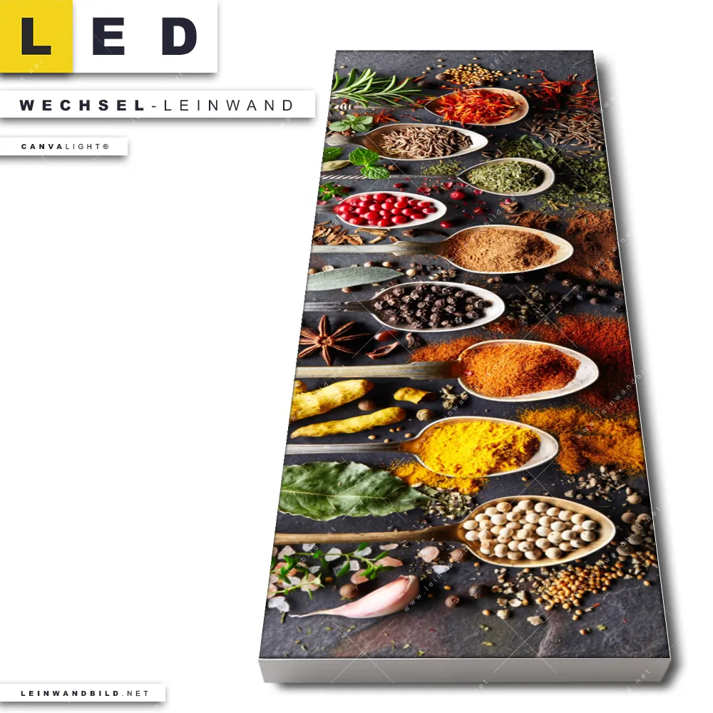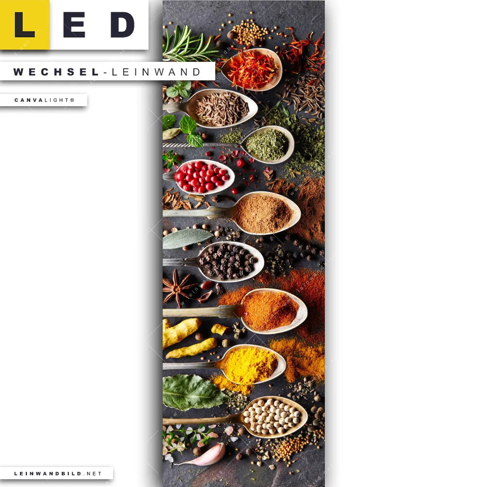 Du bist auf der Suche nach einer Essen - Trinken Wechsel-Leinwand für Dein LED-Leinwandbild im Schmalen Format? Begriffe wie Gewürze, Kräuter, Löffel, kochen, Pfeffer, Curry haben Dich auf der Suche nach Deiner Ersatz-Leinwand für dein LED Wandbild im Panorama-Hochformat mit wechselbarer Leinwand inspiriert? Farben wie Bunt, Schwarz dürfen auf Deinem neuen Wechselmotiv für Dein XXL Leinwand-LED-Bild nicht fehlen und Leinwände im Modern Art, Natürlich - Realistisch Stil für Leuchtbilder passen perfekt zu Deinem Einrichtungsstil?