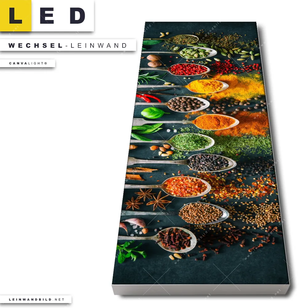 Du konfigurierst Deine individuelle LED Wechsel-Leinwand Canvalight® TEX | Gewürze auf Löffeln | Schmal und wir produzieren sie NEU für Dich. Unsere Essen - Trinken Austausch-Fotoleinwände für Canvalight® LED Bilder sind KEINE Lagerware. Du bist Dir unsicher, welches Motiv oder Format das richtige für dein individuelles LED Wechselmotiv auf Leinwand ist, dann helfen wir dir gerne weiter und beraten dich!