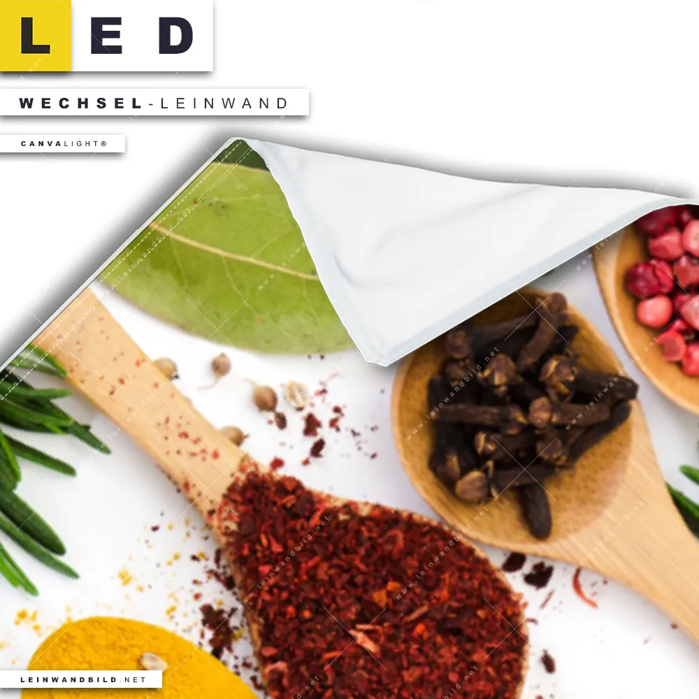 LED Wechsel-Leinwand Canvalight® TEX | Gewürze auf Löffeln - weiß | Panorama