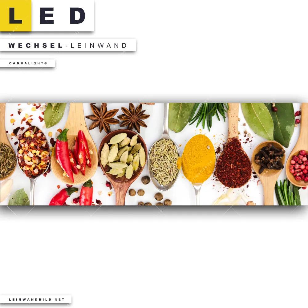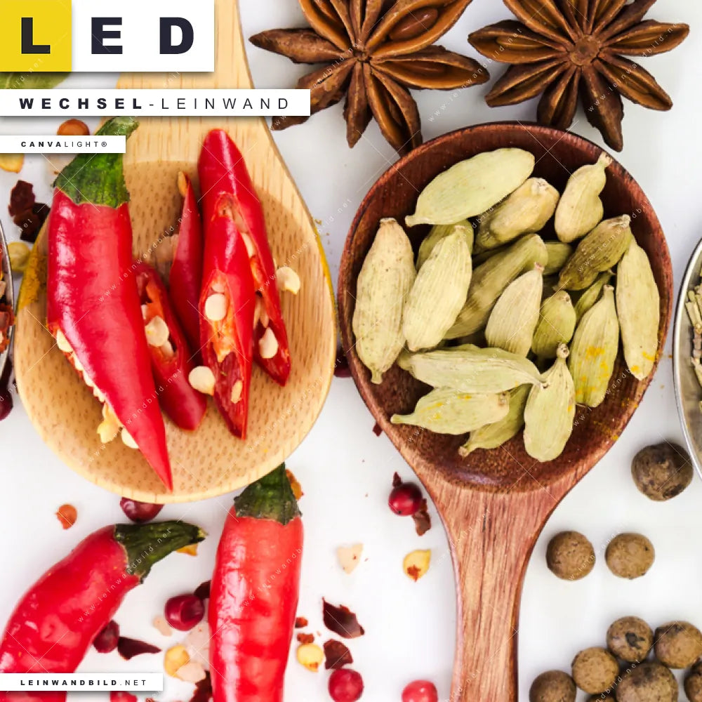 Du bist auf der Suche nach einer Essen - Trinken Wechsel-Leinwand für Dein LED-Leinwandbild im Panorama-Format? Begriffe wie Gewürze, Kräuter, Löffel, kochen, Pfeffer, Salz, Curry, Chili haben Dich auf der Suche nach Deiner Ersatz-Leinwand für dein extra breites LED Wandbild mit wechselbarer Leinwand inspiriert? Farben wie Bunt, Schwarz dürfen auf Deinem neuen Wechselmotiv für Dein XXL Leinwand-LED-Bild nicht fehlen und Leinwände im Modern Art, Natürlich - Realistisch Stil für Leuchtbilder passen perfekt zu Deinem Einrichtungsstil?