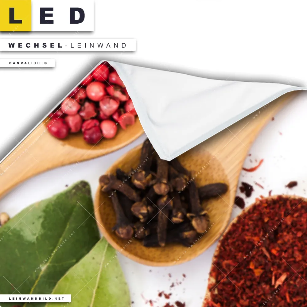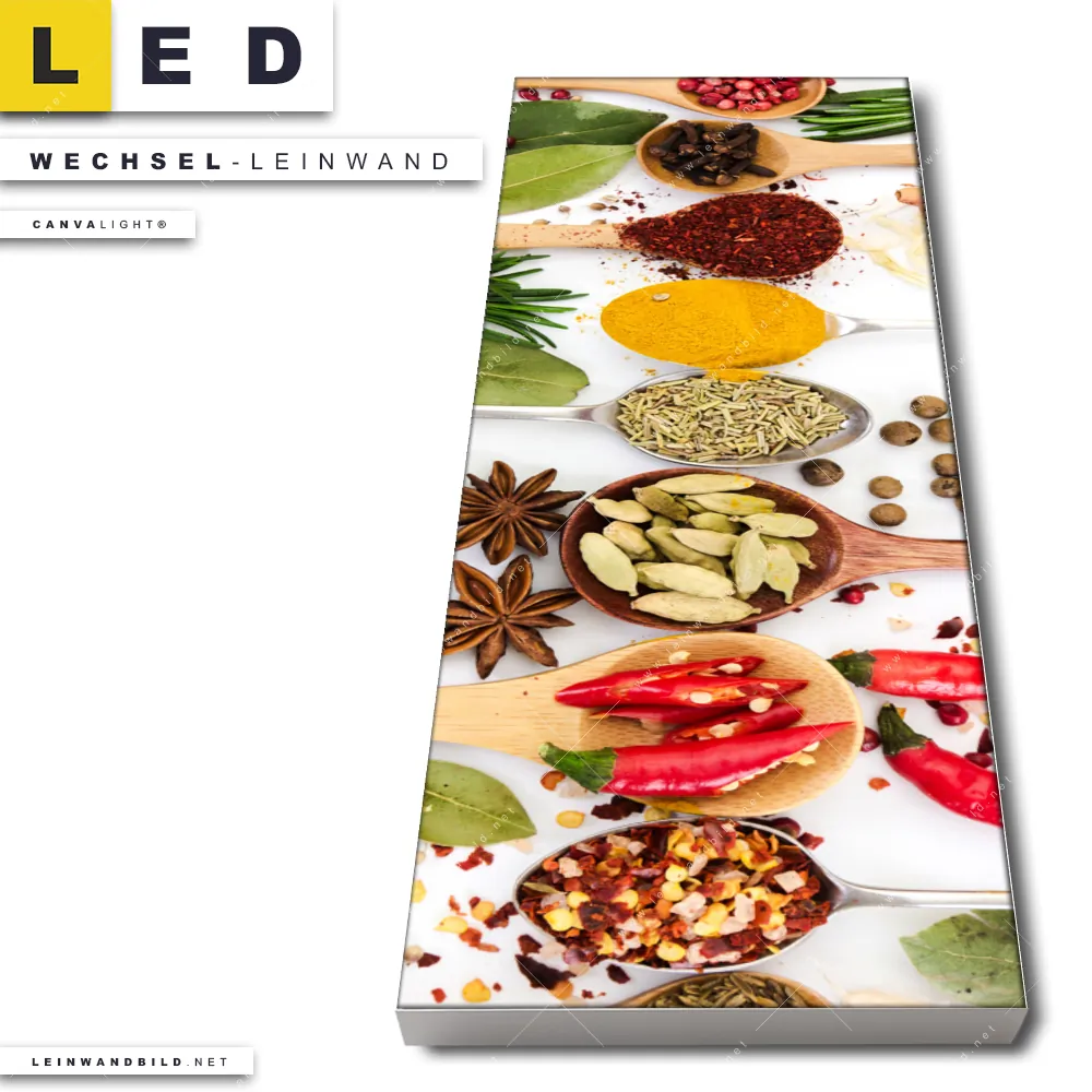 Du bist auf der Suche nach einer Essen - Trinken Wechsel-Leinwand für Dein LED-Leinwandbild im Schmalen Format? Begriffe wie Gewürze, Kräuter, Löffel, kochen, Pfeffer, Salz, Curry, Chili haben Dich auf der Suche nach Deiner Ersatz-Leinwand für dein LED Wandbild im Panorama-Hochformat mit wechselbarer Leinwand inspiriert? Farben wie Bunt, Schwarz dürfen auf Deinem neuen Wechselmotiv für Dein XXL Leinwand-LED-Bild nicht fehlen und Leinwände im Modern Art, Natürlich - Realistisch Stil für Leuchtbilder passen perfekt zu Deinem Einrichtungsstil?