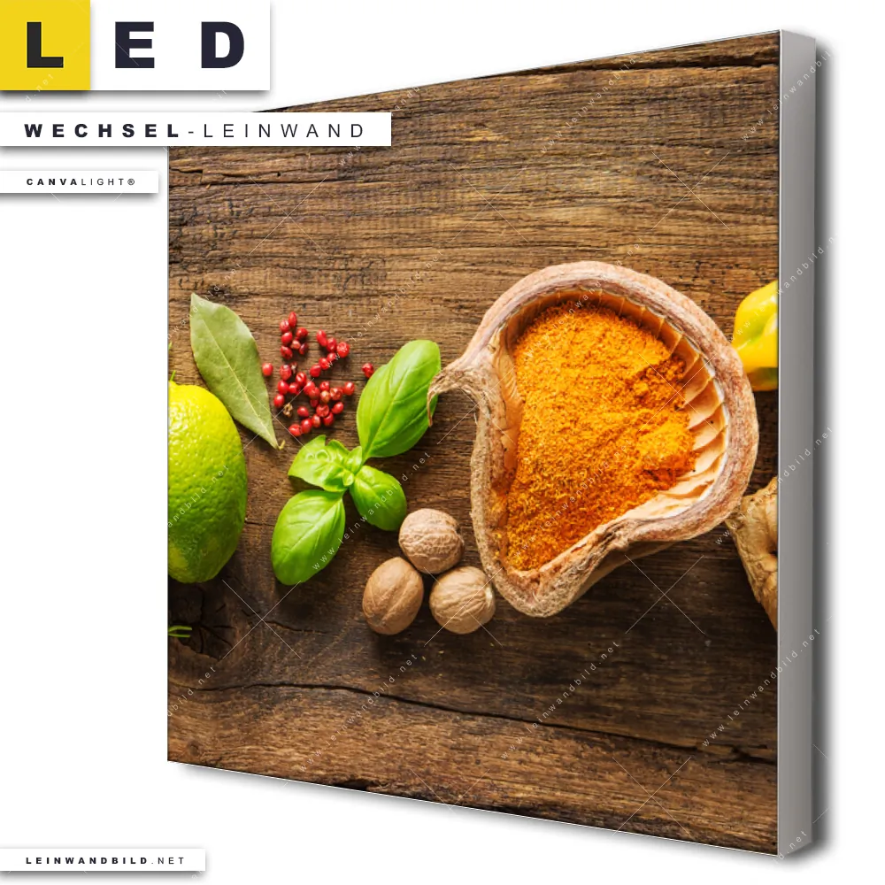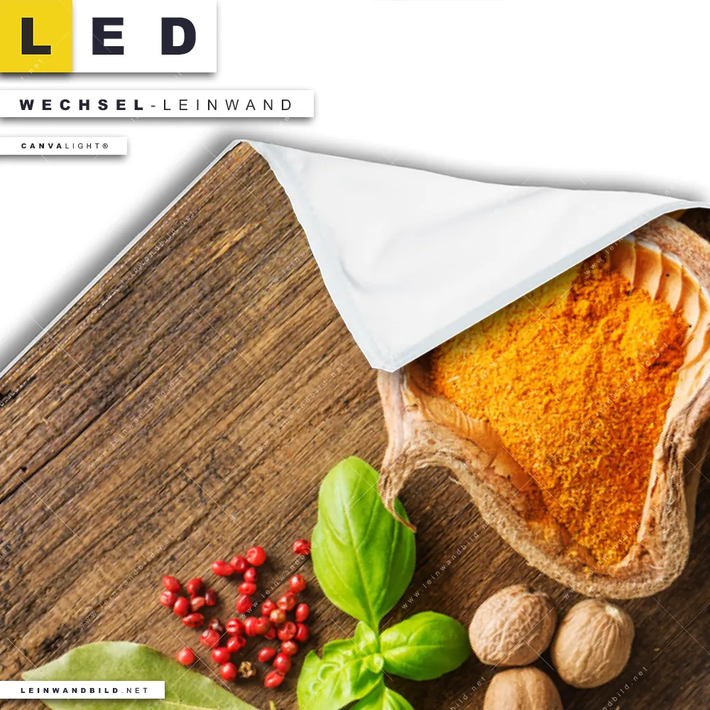 Du bist auf der Suche nach einer Essen - Trinken Wechsel-Leinwand für Dein LED-Leinwandbild im Quadratischen Format? Begriffe wie Gewürze, Kräuter, kochen, Chili, Pfeffer, Ingwer, Paprika, Holz, Knoblauch, Essen, Küche haben Dich auf der Suche nach Deiner Ersatz-Leinwand für dein LED Wandbild mit wechselbarer Leinwand inspiriert? Farben wie Braun, Rot, Grün dürfen auf Deinem neuen Wechselmotiv für Dein XXL Leinwand-LED-Bild nicht fehlen und Leinwände im Modern Art, Natürlich - Realistisch Stil für Leuchtbilder passen perfekt zu Deinem Einrichtungsstil?