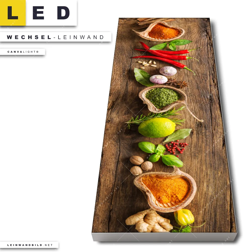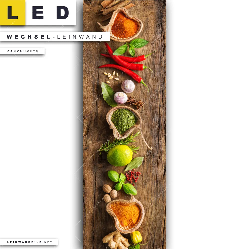 Du bist auf der Suche nach einer Essen - Trinken Wechsel-Leinwand für Dein LED-Leinwandbild im Schmalen Format? Begriffe wie Gewürze, Kräuter, kochen, Chili, Pfeffer, Ingwer, Paprika, Holz, Knoblauch, Essen, Küche haben Dich auf der Suche nach Deiner Ersatz-Leinwand für dein LED Wandbild im Panorama-Hochformat mit wechselbarer Leinwand inspiriert? Farben wie Braun, Rot, Grün dürfen auf Deinem neuen Wechselmotiv für Dein XXL Leinwand-LED-Bild nicht fehlen und Leinwände im Modern Art, Natürlich - Realistisch Stil für Leuchtbilder passen perfekt zu Deinem Einrichtungsstil?