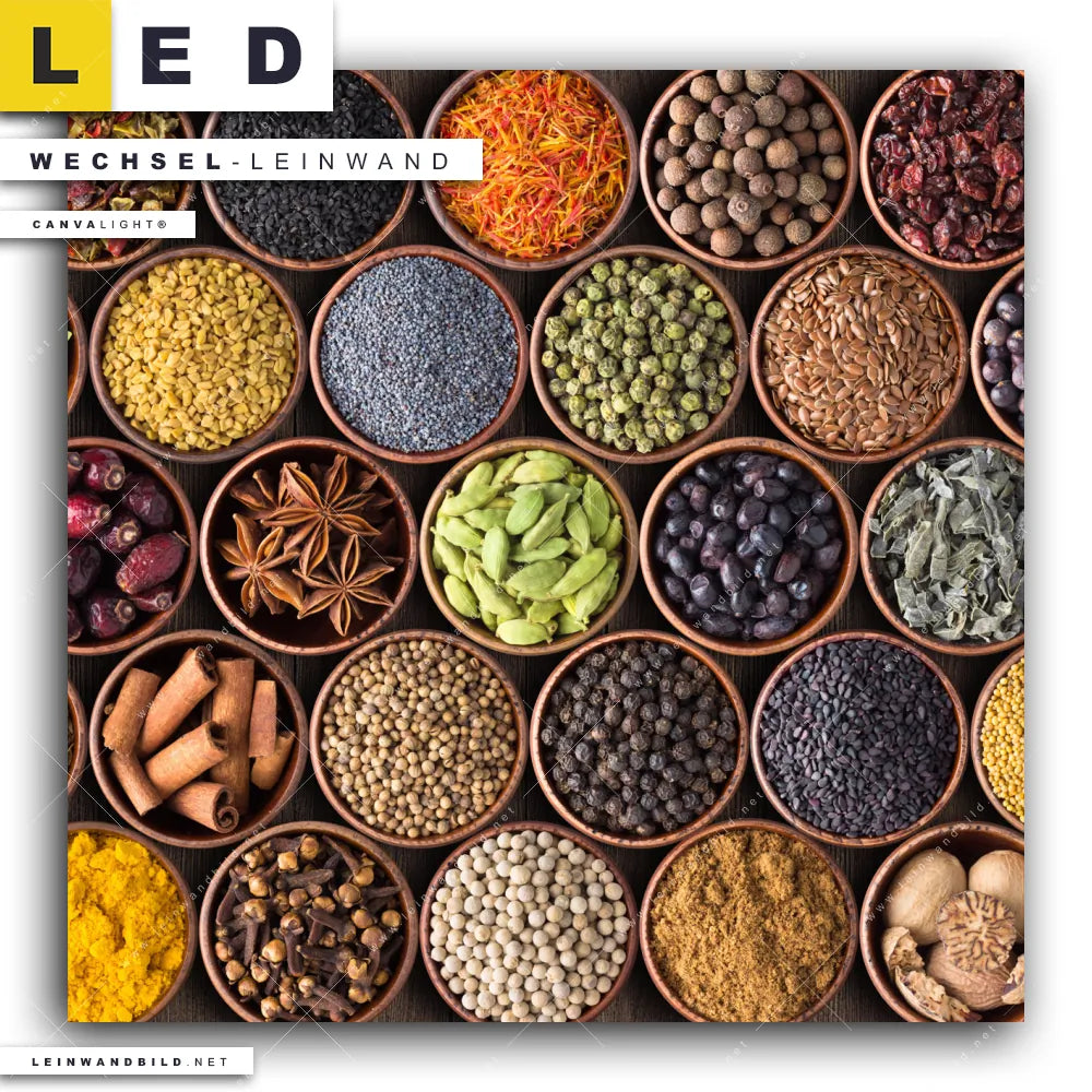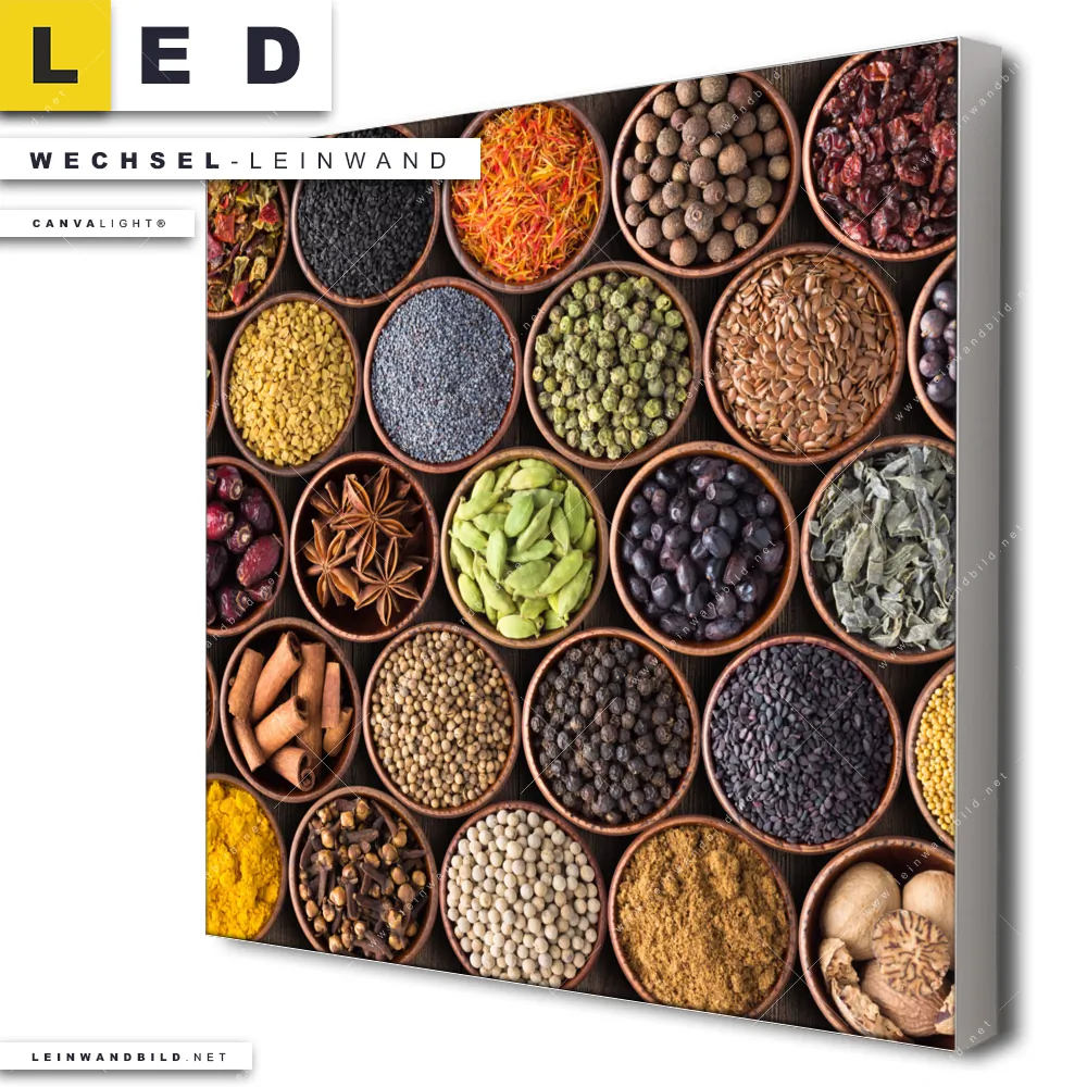 Du bist auf der Suche nach einer Essen - Trinken Wechsel-Leinwand für Dein LED-Leinwandbild im Quadratischen Format? Begriffe wie Gewürze, Kräuter, kochen, Chili, Pfeffer, Ingwer, Paprika haben Dich auf der Suche nach Deiner Ersatz-Leinwand für dein LED Wandbild mit wechselbarer Leinwand inspiriert? Farben wie Bunt dürfen auf Deinem neuen Wechselmotiv für Dein XXL Leinwand-LED-Bild nicht fehlen und Leinwände im Modern Art, Natürlich - Realistisch Stil für Leuchtbilder passen perfekt zu Deinem Einrichtungsstil?