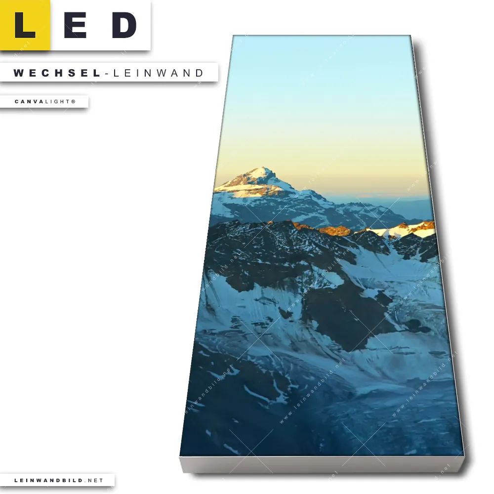 Du konfigurierst Deine individuelle LED Wechsel-Leinwand Canvalight® TEX | Gipfel in den Alpen | Schmal und wir produzieren sie NEU für Dich. Unsere Landschaften Austausch-Fotoleinwände für Canvalight® LED Bilder sind KEINE Lagerware. Du bist Dir unsicher, welches Motiv oder Format das richtige für dein individuelles LED Wechselmotiv auf Leinwand ist, dann helfen wir dir gerne weiter und beraten dich!