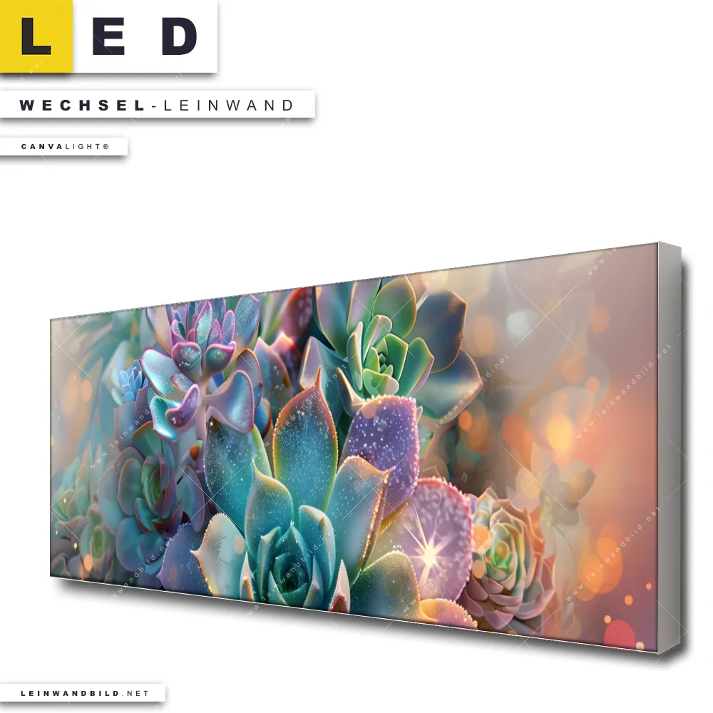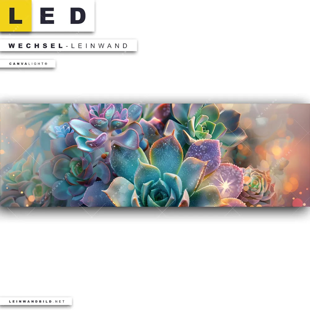 Du konfigurierst Deine individuelle LED Wechsel-Leinwand Canvalight® TEX | Glänzende Sukkulenten | Panorama und wir produzieren sie NEU für Dich. Unsere Blumen - Botanik Austausch-Fotoleinwände für Canvalight® LED Bilder sind KEINE Lagerware. Du bist Dir unsicher, welches Motiv oder Format das richtige für dein individuelles LED Wechselmotiv auf Leinwand ist, dann helfen wir dir gerne weiter und beraten dich!