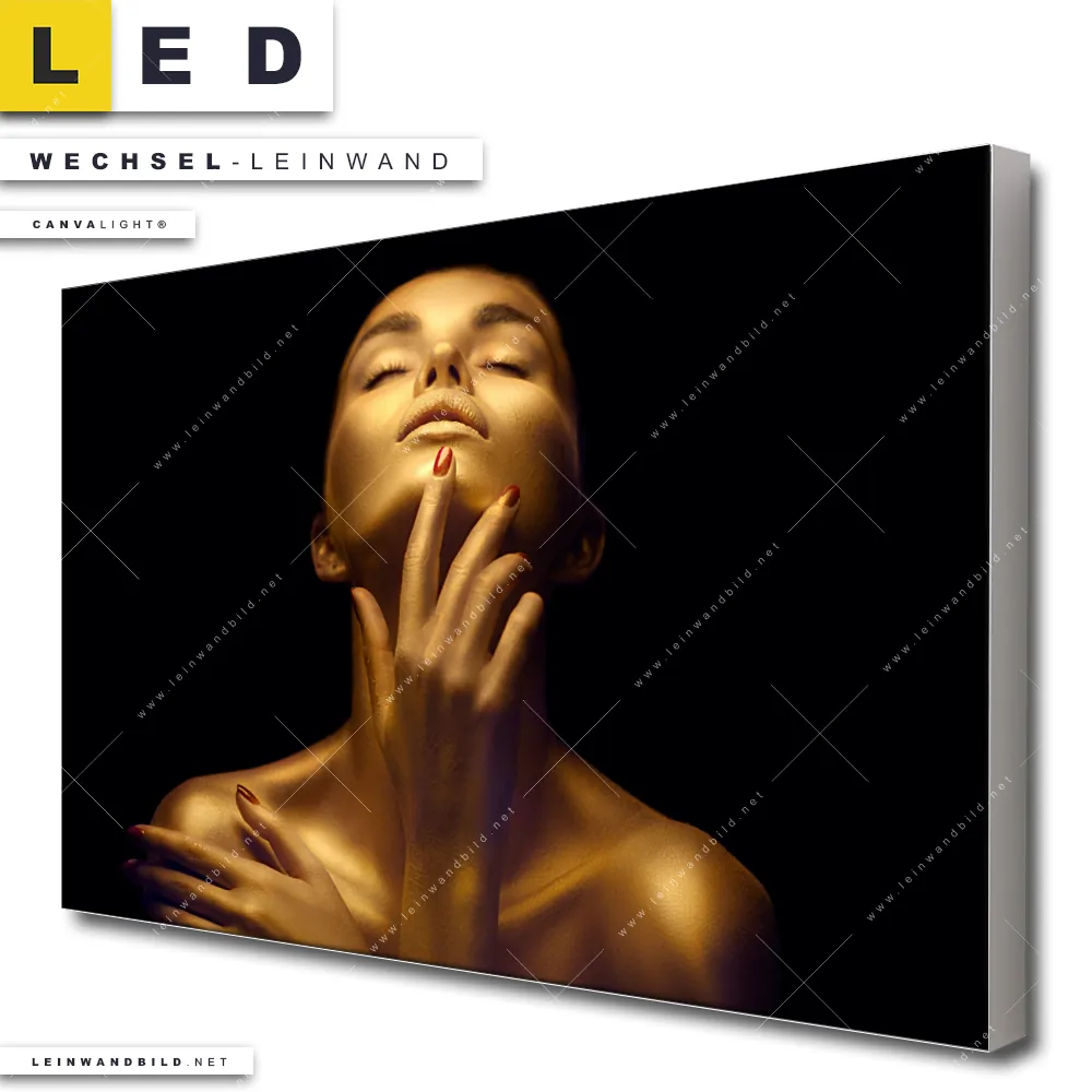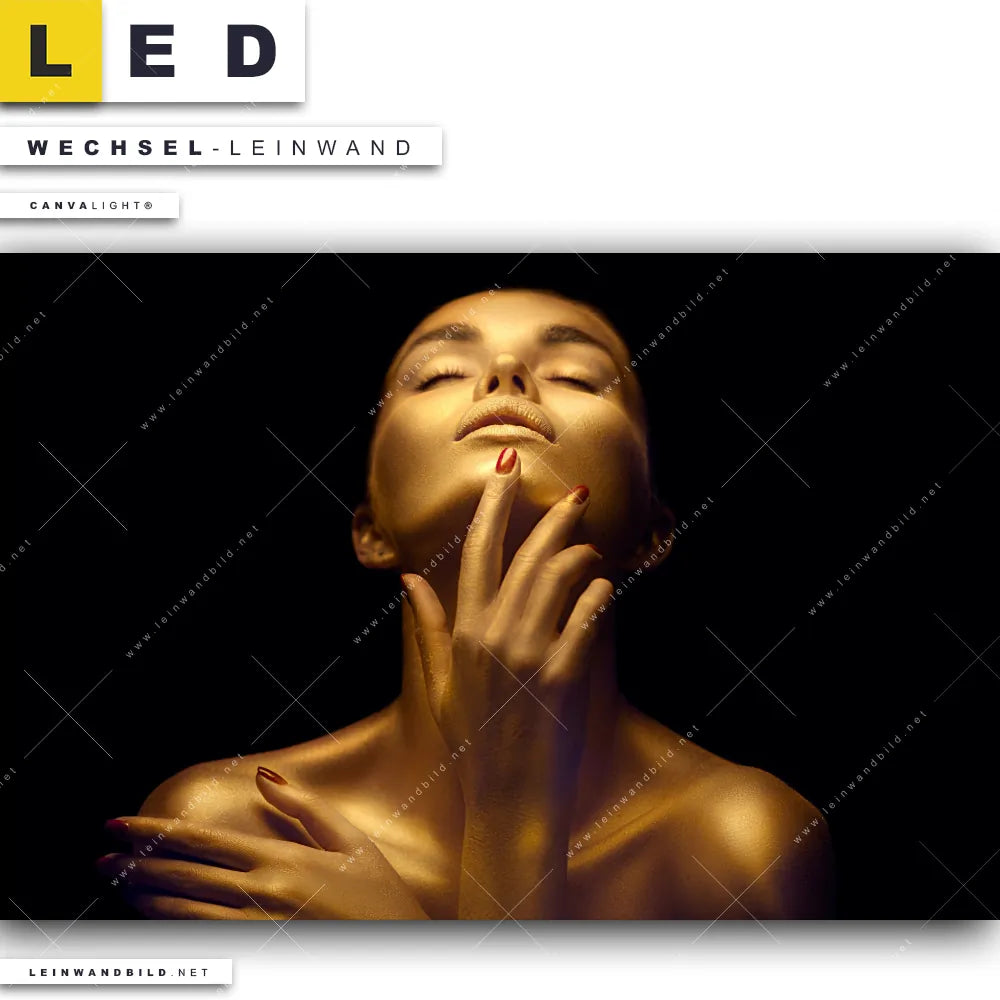 Du bist auf der Suche nach einer Porträts - Menschen Wechsel-Leinwand für Dein LED-Leinwandbild im Querformat? Begriffe wie Frau, Farbe, Beauty, Gesicht, Körper haben Dich auf der Suche nach Deiner Ersatz-Leinwand für dein breites LED Wandbild mit wechselbarer Leinwand inspiriert? Farben wie Gold, Schwarz dürfen auf Deinem neuen Wechselmotiv für Dein XXL Leinwand-LED-Bild nicht fehlen und Leinwände im Modern Art Stil für Leuchtbilder passen perfekt zu Deinem Einrichtungsstil?