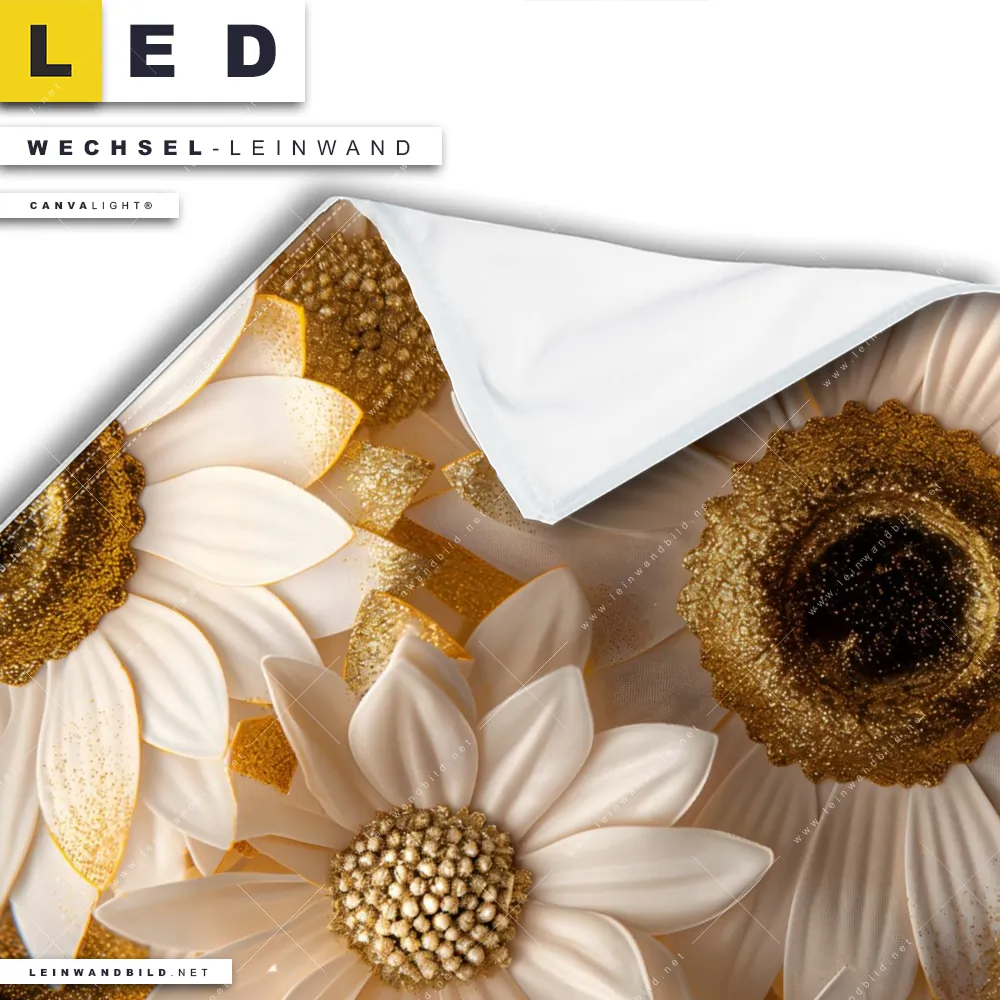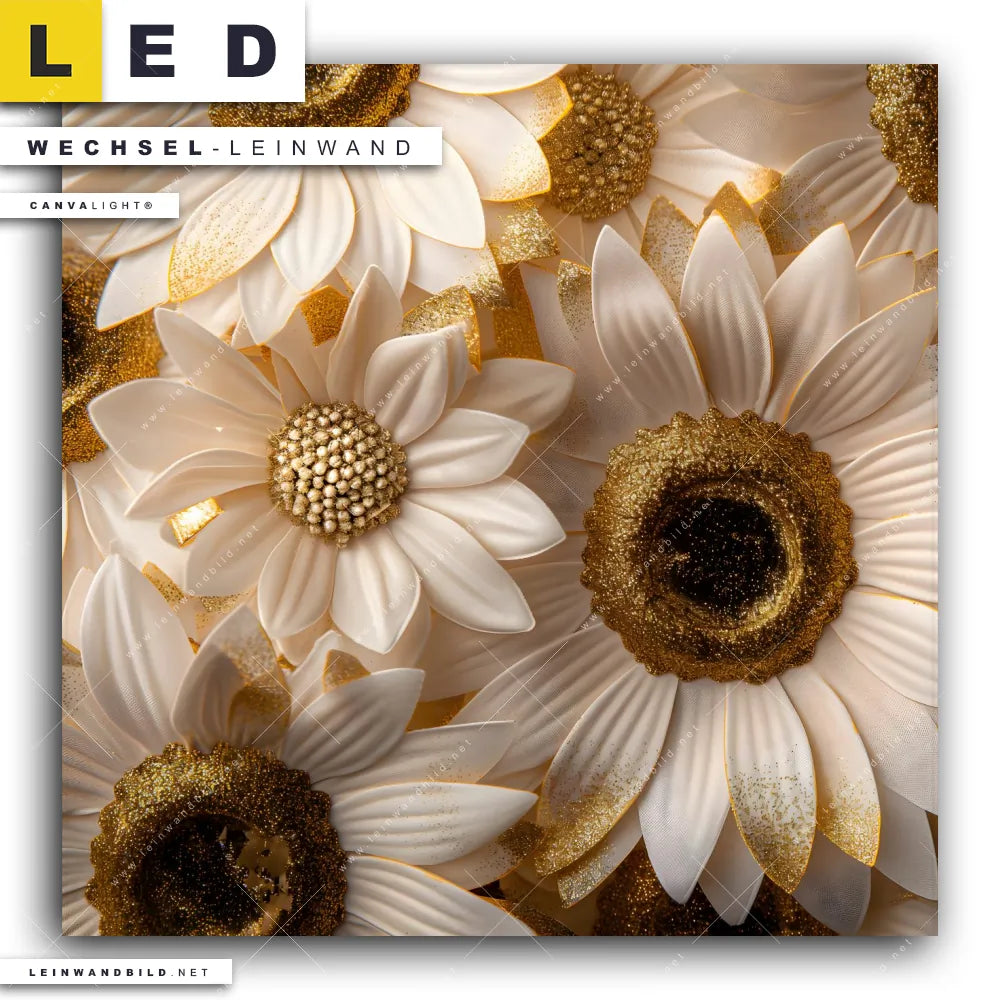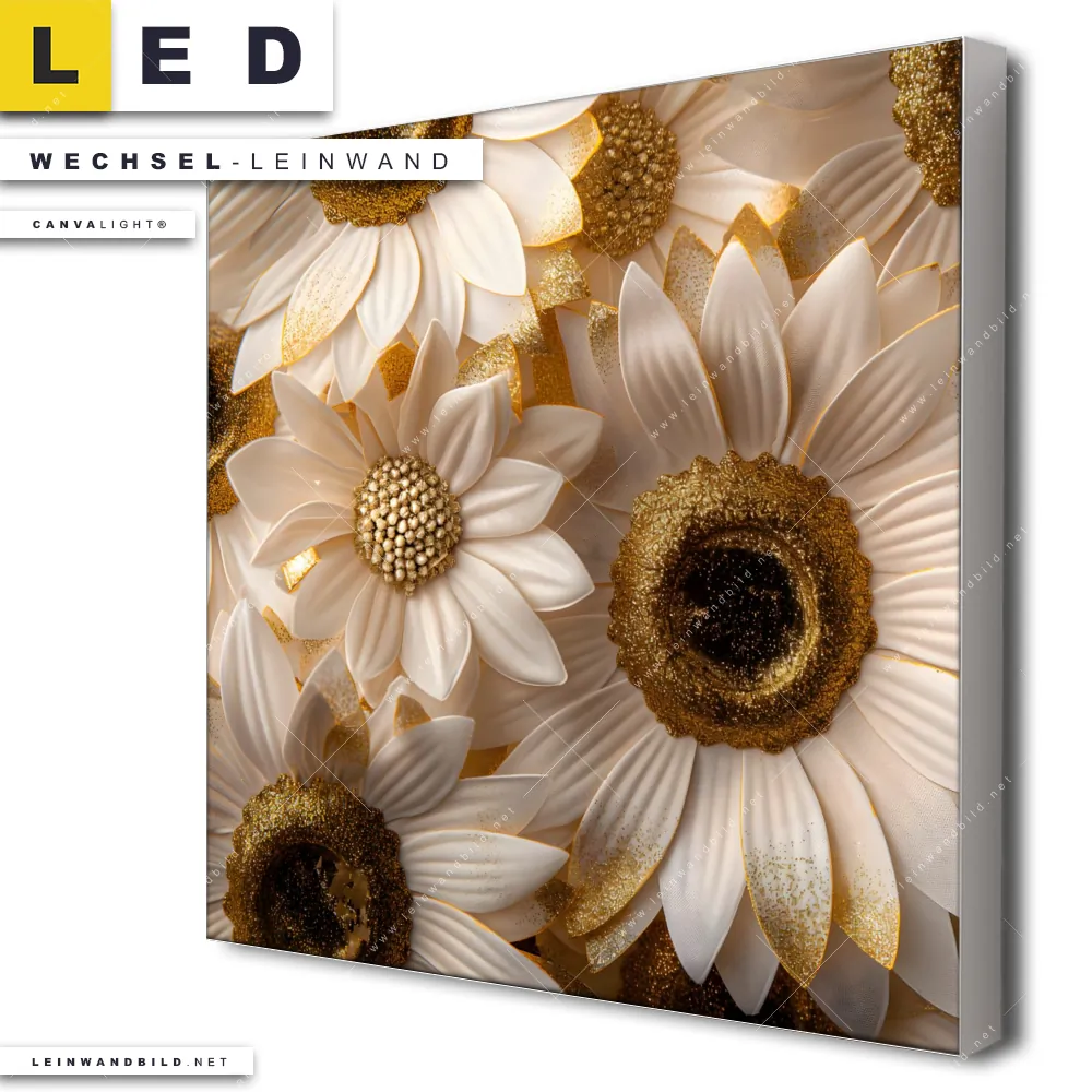 Du bist auf der Suche nach einer Blumen - Botanik Wechsel-Leinwand für Dein LED-Leinwandbild im Quadratischen Format? Begriffe wie Blüten, Natur, Pflanze, Glitzer, Blütenmeer, Sonnenblumen haben Dich auf der Suche nach Deiner Ersatz-Leinwand für dein LED Wandbild mit wechselbarer Leinwand inspiriert? Farben wie Weiss, Gold, Braun dürfen auf Deinem neuen Wechselmotiv für Dein XXL Leinwand-LED-Bild nicht fehlen und Leinwände im Floral, Modern Art Stil für Leuchtbilder passen perfekt zu Deinem Einrichtungsstil?