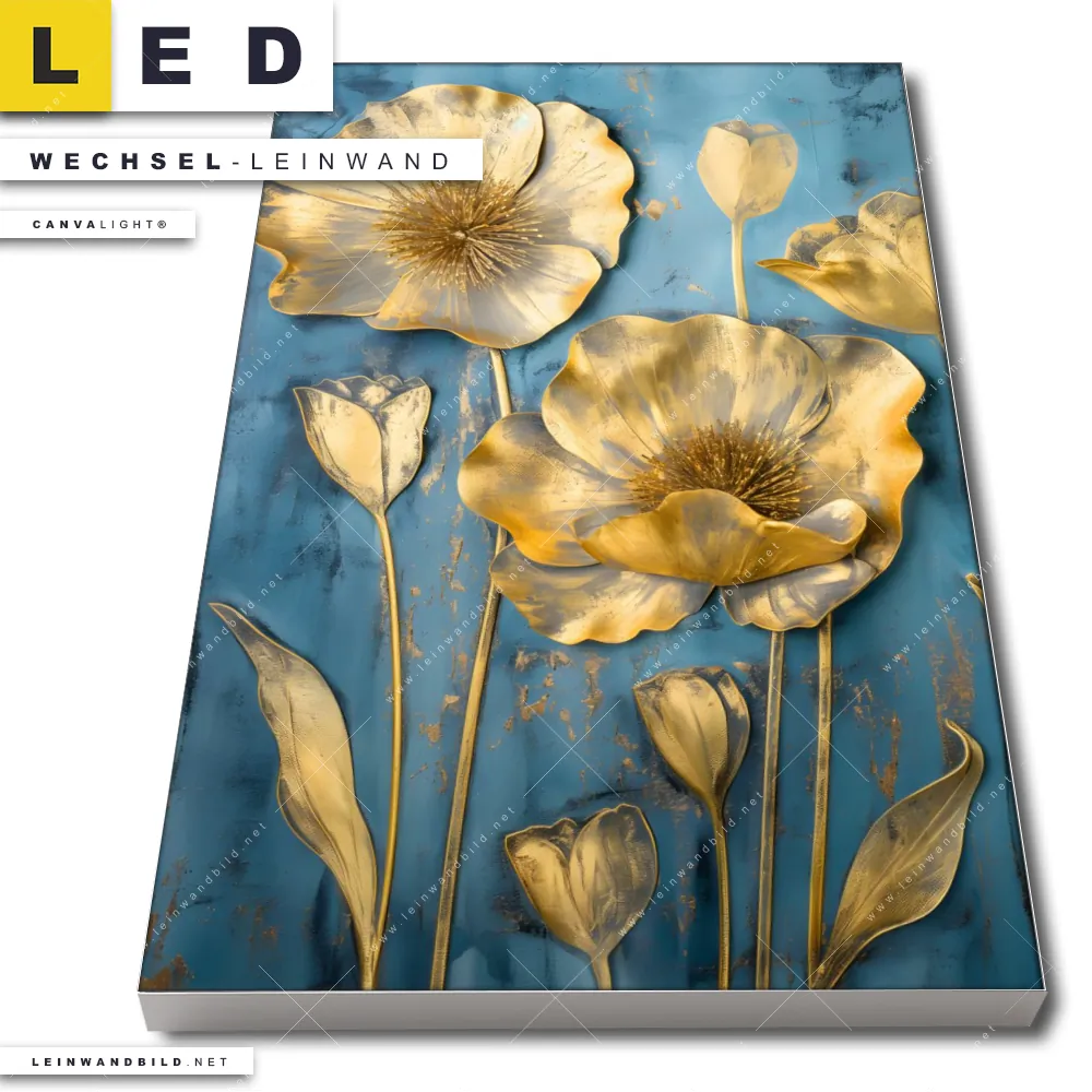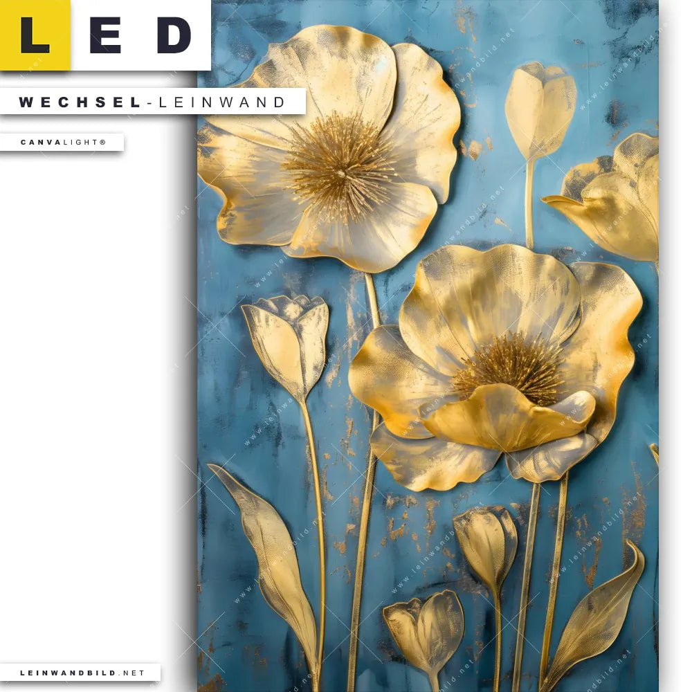 LED Wechsel-Leinwand Canvalight® TEX | Goldene Blumen auf Blau | Hochformat