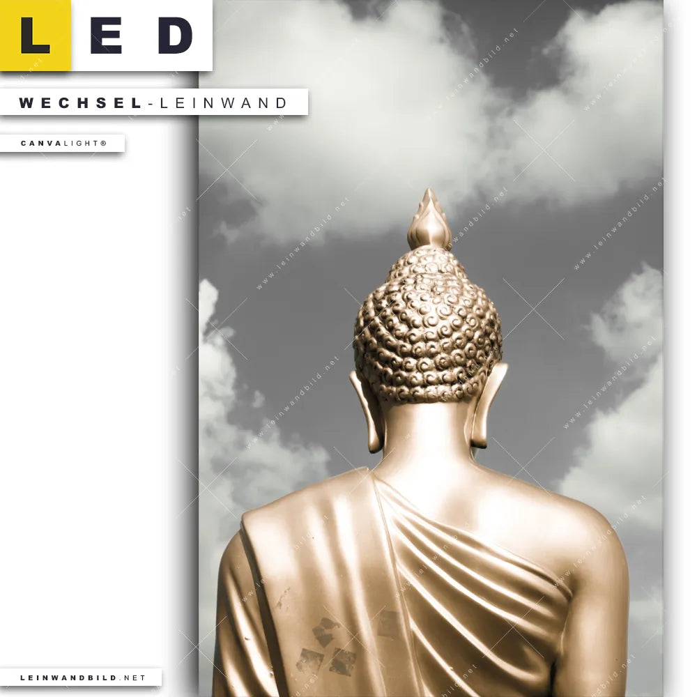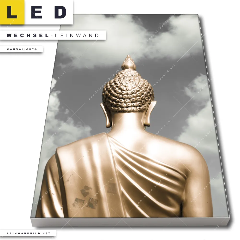 LED Wechsel-Leinwand Canvalight® TEX | Goldene Buddha Statue | Hochformat