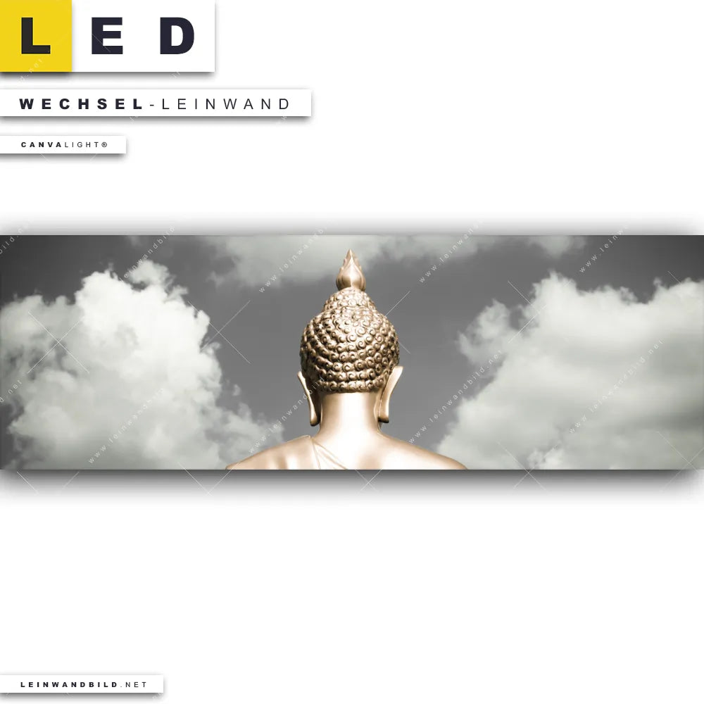Dann sollte die Wechsel-Leinwand Canvalight® TEX | Goldene Buddha Statue | Panorama den Weg zu Dir finden. Die Austausch-Leinwand Buddha-Skulptur Ansicht von hinten - passend für unsere stufenlos dimmbaren, steckerfertigen Leinwandbilder im LED Leuchtrahmen mit Fernbedienung und optionaler Farbtemperatursteuerung - fügt sich als Eye-Catcher harmonisch in jedes Arzt - Praxis, Wohnzimmer - Schlafzimmer, Büro - Kanzlei, Flur - Eingangsbereich, Friseur - Beauty Raumkonzept ein.