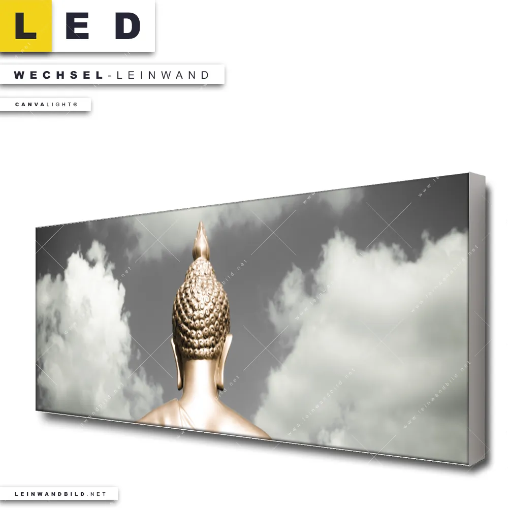 Du konfigurierst Deine individuelle LED Wechsel-Leinwand Canvalight® TEX | Goldene Buddha Statue | Panorama und wir produzieren sie NEU für Dich. Unsere Buddha - Feng Shui Austausch-Fotoleinwände für Canvalight® LED Bilder sind KEINE Lagerware. Du bist Dir unsicher, welches Motiv oder Format das richtige für dein individuelles LED Wechselmotiv auf Leinwand ist, dann helfen wir dir gerne weiter und beraten dich!
