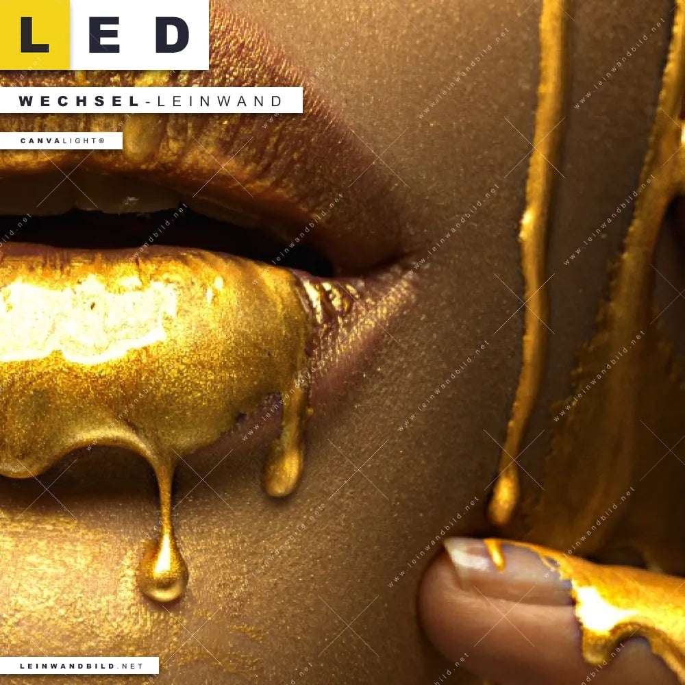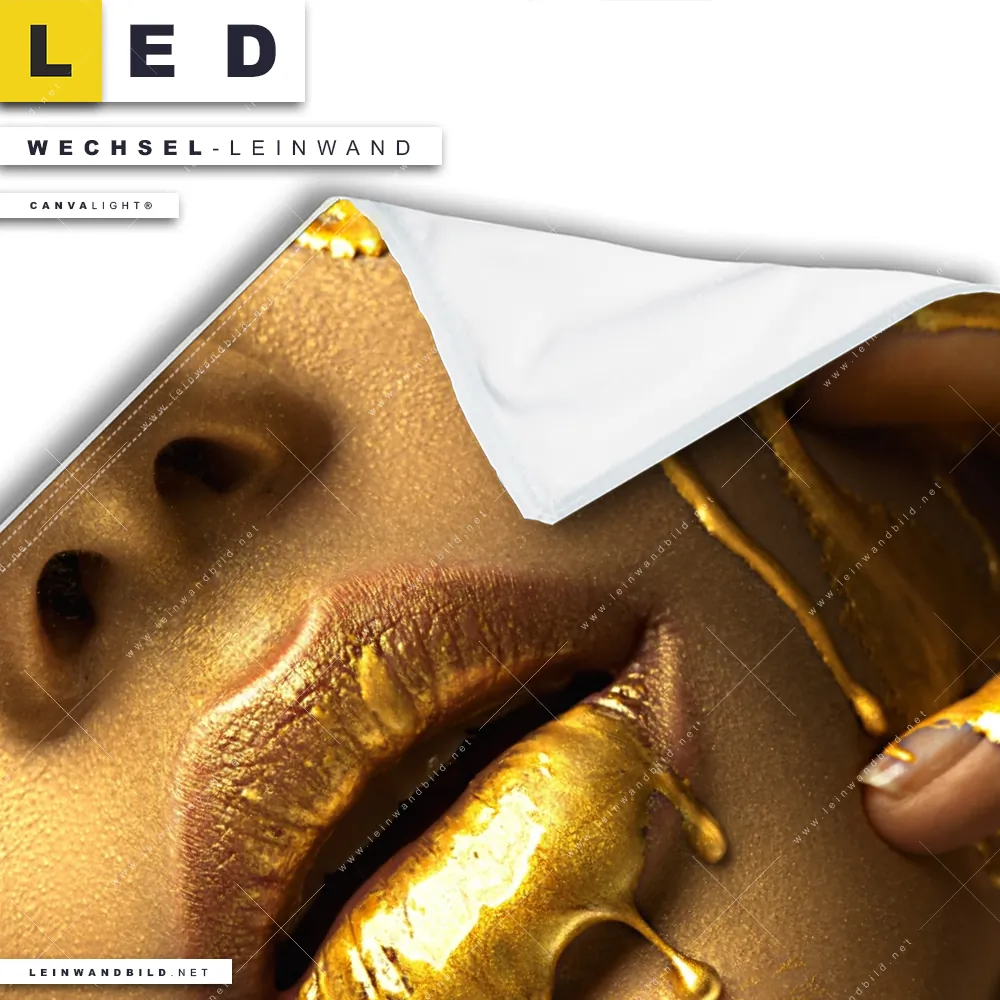 Dann sollte die Wechsel-Leinwand Canvalight® TEX | Goldene Lippen | Quadrat den Weg zu Dir finden. Die Austausch-Leinwand Goldener Mund - passend für unsere stufenlos dimmbaren, steckerfertigen Leinwandbilder im Leuchtrahmen mit Fernbedienung und optionaler Farbtemperatursteuerung - fügt sich als Eye-Catcher harmonisch in jedes Bar - Gastronomie, Friseur - Beauty, Wohnzimmer - Schlafzimmer Raumkonzept ein.