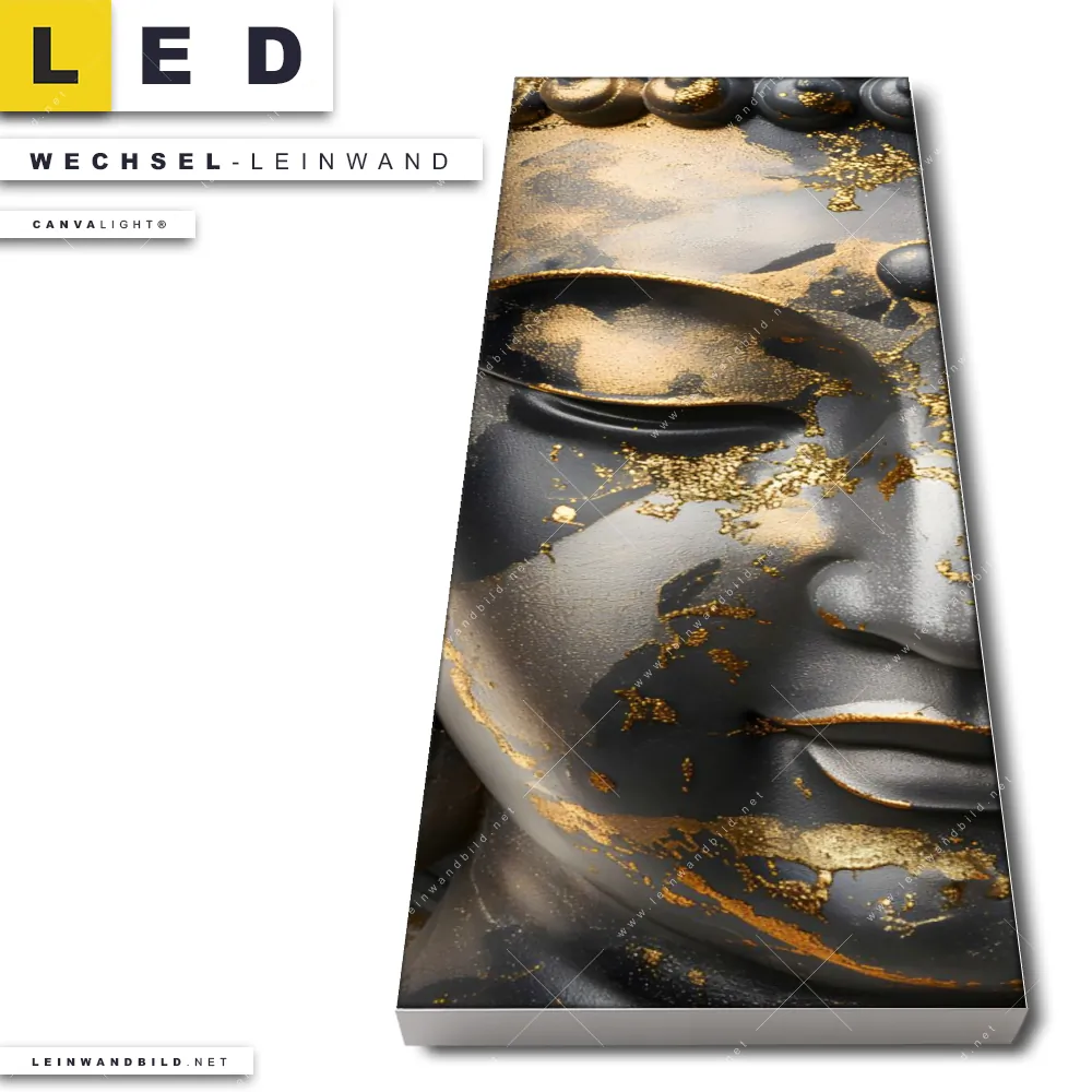 Du konfigurierst Deine individuelle LED Wechsel-Leinwand Canvalight® TEX | Goldener Buddha Fluid Art | Schmal und wir produzieren sie NEU für Dich. Unsere Buddha - Feng Shui Austausch-Fotoleinwände für Canvalight® LED Bilder sind KEINE Lagerware. Du bist Dir unsicher, welches Motiv oder Format das richtige für dein individuelles LED Wechselmotiv auf Leinwand ist, dann helfen wir dir gerne weiter und beraten dich!