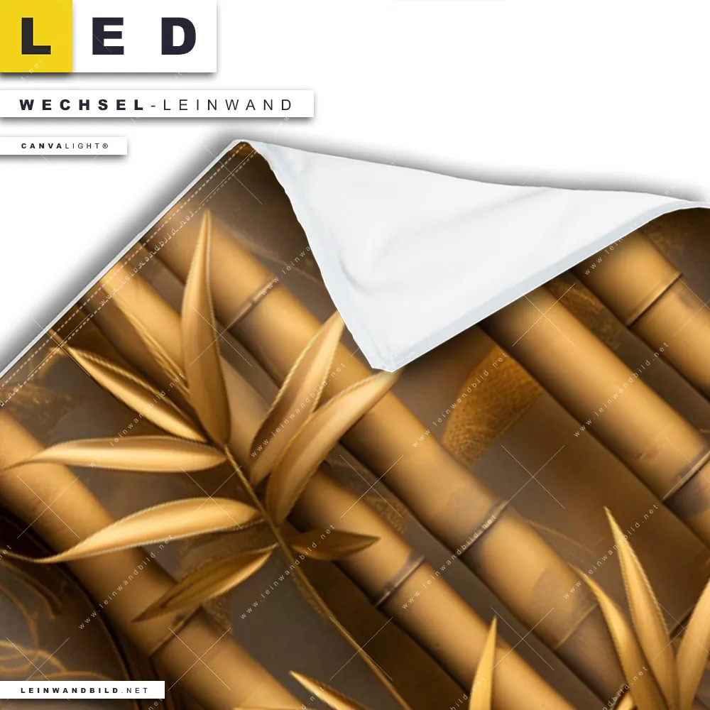 Bitte beachte, dass die Farben, der auf dem Monitor abgebildeten Spiritueller Buddha und Bambuskunst Darstellung, möglicherweise von den Originalfarben deiner Canvalight® TEX Wechsel-Leinwand abweichen können.