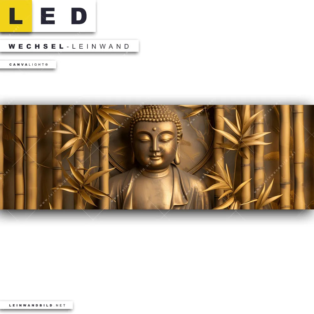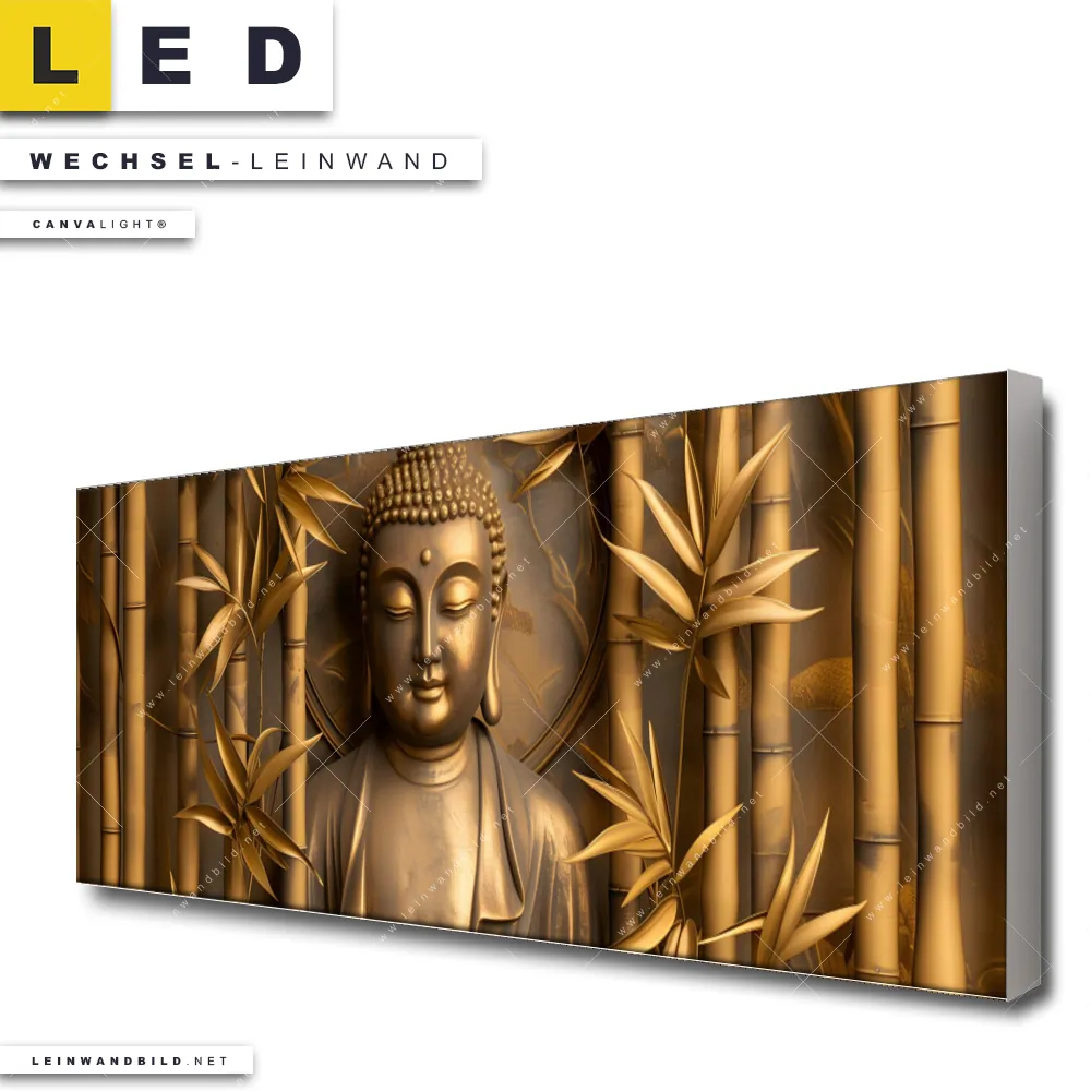 Du bist auf der Suche nach einer Buddha - Feng Shui Wechsel-Leinwand für Dein LED-Leinwandbild im Panorama-Format? Begriffe wie Bambus, Buddha, Statue, Asien, Buddhismus, Religion, Feng Shui, Zen, Meditation haben Dich auf der Suche nach Deiner Ersatz-Leinwand für dein extra breites LED Wandbild mit wechselbarer Leinwand inspiriert? Farben wie Gold, Braun, Beige dürfen auf Deinem neuen Wechselmotiv für Dein XXL Leinwand-LED-Bild nicht fehlen und Leinwände im Modern Art Stil für Leuchtbilder passen perfekt zu Deinem Einrichtungsstil?