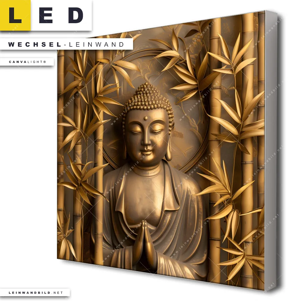 Du konfigurierst Deine individuelle LED Wechsel-Leinwand Canvalight® TEX | Goldener Buddha im Bambuswald | Quadrat und wir produzieren sie NEU für Dich. Unsere Buddha - Feng Shui Austausch-Fotoleinwände für Canvalight® LED Bilder sind KEINE Lagerware. Du bist Dir unsicher, welches Motiv oder Format das richtige für dein individuelles LED Wechselmotiv auf Leinwand ist, dann helfen wir dir gerne weiter und beraten dich!