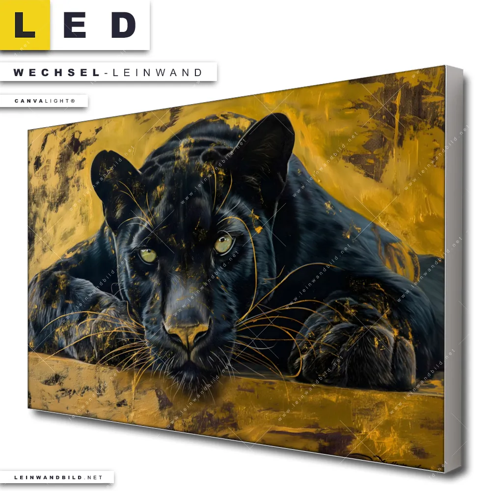 Du bist auf der Suche nach einer Tierwelt Wechsel-Leinwand für Dein LED-Leinwandbild im Querformat? Begriffe wie Nahaufnahme, Panther, Raubkatze, Wildkatze, Tierporträt, Farbspritzer haben Dich auf der Suche nach Deiner Ersatz-Leinwand für dein breites LED Wandbild mit wechselbarer Leinwand inspiriert? Farben wie Schwarz, Gold dürfen auf Deinem neuen Wechselmotiv für Dein XXL Leinwand-LED-Bild nicht fehlen und Leinwände im Abstrakt, Modern Art Stil für Leuchtbilder passen perfekt zu Deinem Einrichtungsstil?